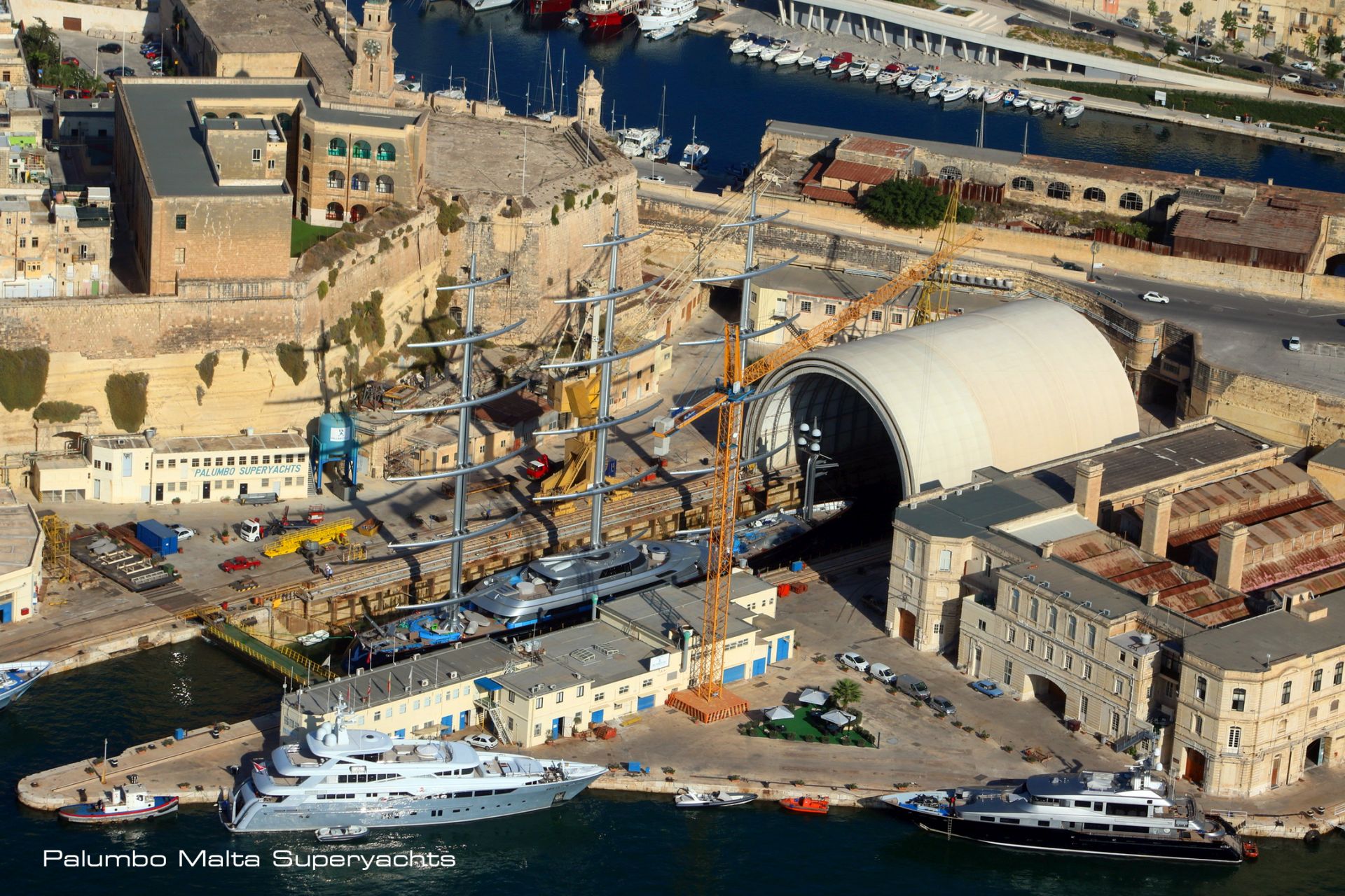 Two striking vessels have reached the Palumbo shipyard in Malta this week: the 119m Blohm + Voss motor yacht 'A', as well as the 88m Perini Navi charter yacht MALTESE FALCON. Both will be refitted by the prestigious Palumbo refit facility.