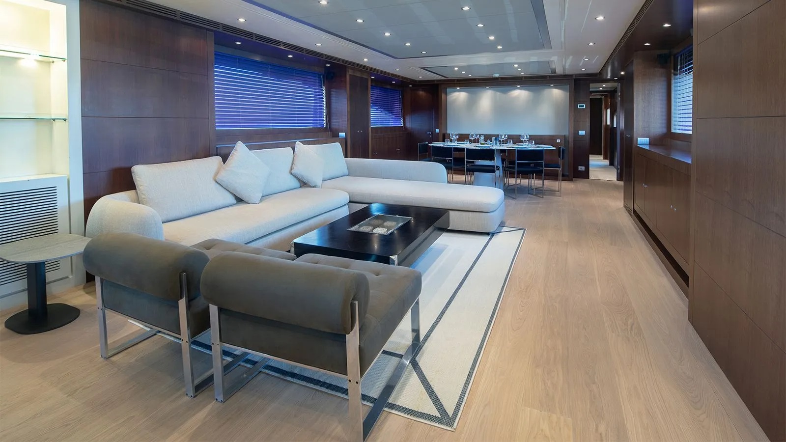 She boasts a designer interior penned by Mauro Micheli featuring contemporary furnishings in the spacious main deck salon and the upper sky lounge. The sky lounge is cleverly set between the large aft sun deck zone and the cosier forward area with access out to both and boasts a huge TV ideal for family movie night or for younger kids to settle quietly in the hottest part of the day.