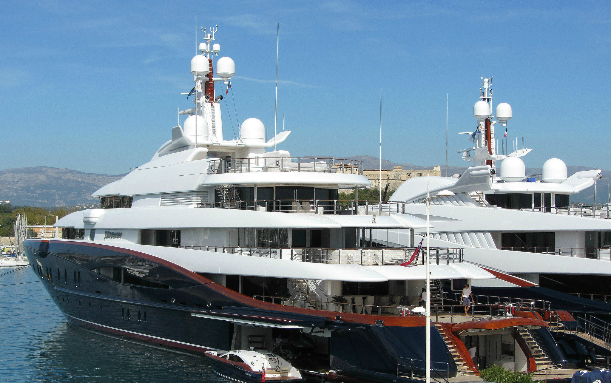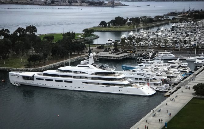 Built by Devonport Yachts (now Pendennis Plus), 96m/318ft VAVA II is the megayacht of Swiss billionaire Ernesto Bertarelli. Spotted while berthed in San Diego, she is currently within the top 50 largest yachts in the world and her 17m/57ft beam creates plenty of space for amenities such as a swimming pool, a fold-down beach club and a helipad.