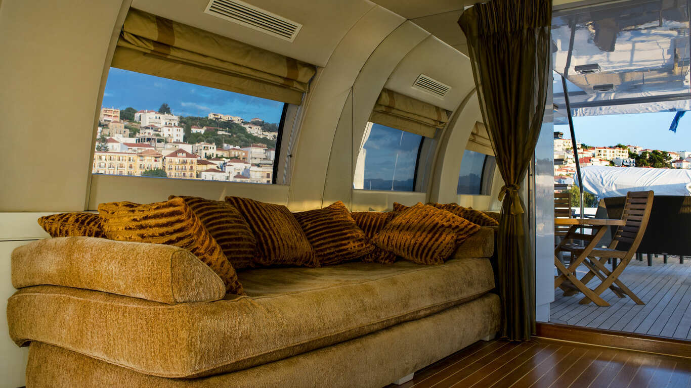 Ten charter guests are accommodated over 5 cabins, while a crew of 6 ensure a most relaxed yachting experience. The yacht’s interior boasts a generous main salon, with separate dining placed amidships. There is an inviting sky lounge above, with additional seating, as well as a full-beam master suite featuring 180-degree panoramic views. Remaining cabins are situated on the lower deck, comprising 2 double and 2 twins.