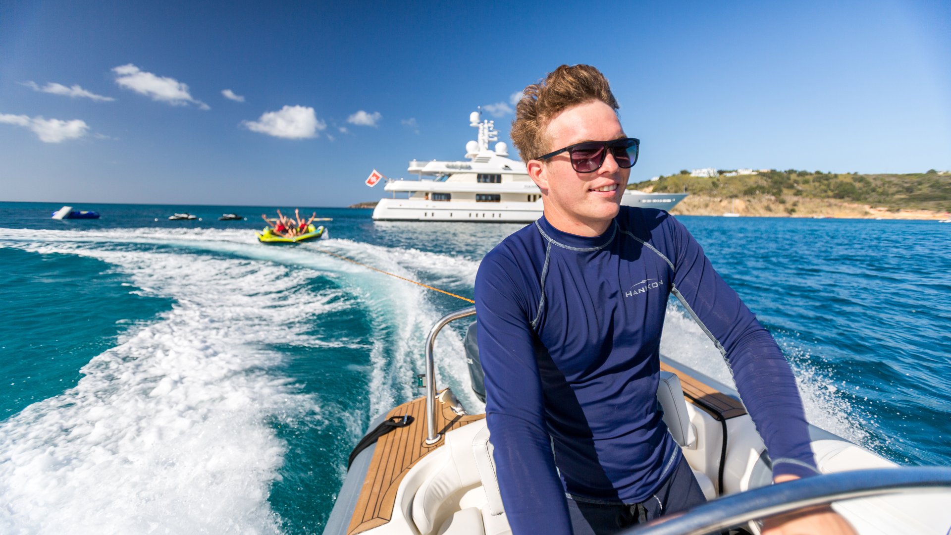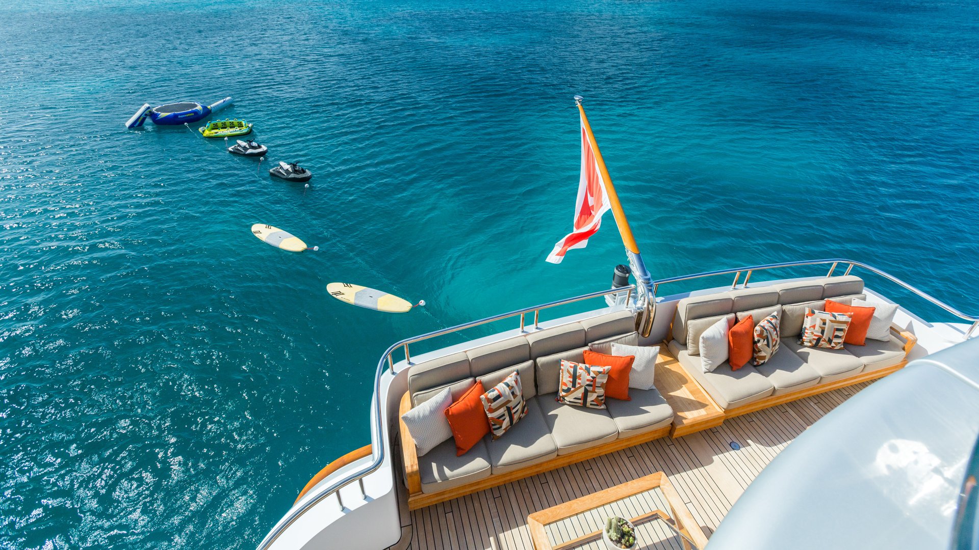 M/Y HANIKON delivers vast exterior living comprising 3 decks, plus a Portuguese bow. The main deck aft is perfect for gathering to enjoy cocktails at sunset, access the swim platform and water toys, or simply relax. The upper deck has outdoor lounge furnishings and al alfresco dining table. Her sundeck steals the limelight, complete with ample sun pads, alfresco dining, wet bar, Jacuzzi and optional shade from large umbrellas.