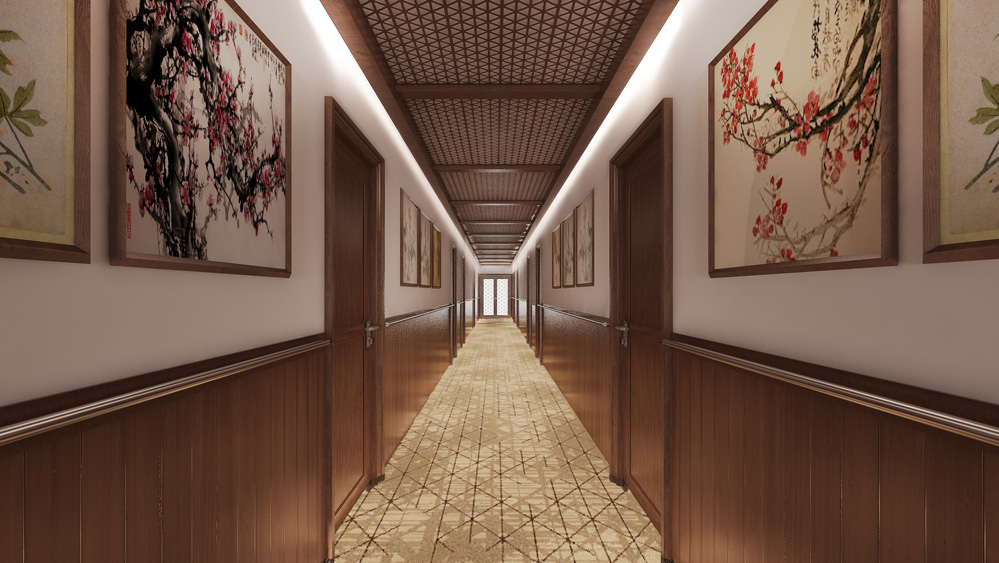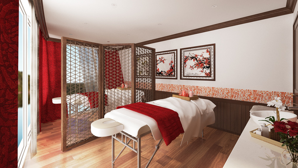 The interior layout features a two-tier reception hall with a reception desk, symmetrical staircases and plenty of vegetation flowing down from the top floor. In the guest cabins, dark wood and rattan are used and the predominantly beige and white colour scheme is joined by accents in red and blue. Practicality is also infused into the design, and there is plenty of storage for luggage as well as charging ports for electronic devices. A massage room and gym are located in the stern for easy guest access from the cabins.