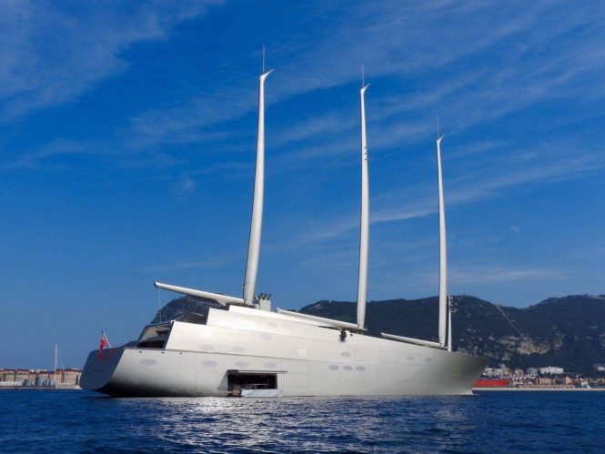Owned by Russian billionaire Andrey Melnichenko (who also owns a motor yacht by the same name), 143m/469ft sailing yacht A is the world’s largest sail-assisted motor yacht and was built by Nobiskrug in 2015 with the naval architecture of Dykstra & Partners. Philippe Starck, Dölker & Voges worked on her exterior design, while the former also created her stunning interiors.