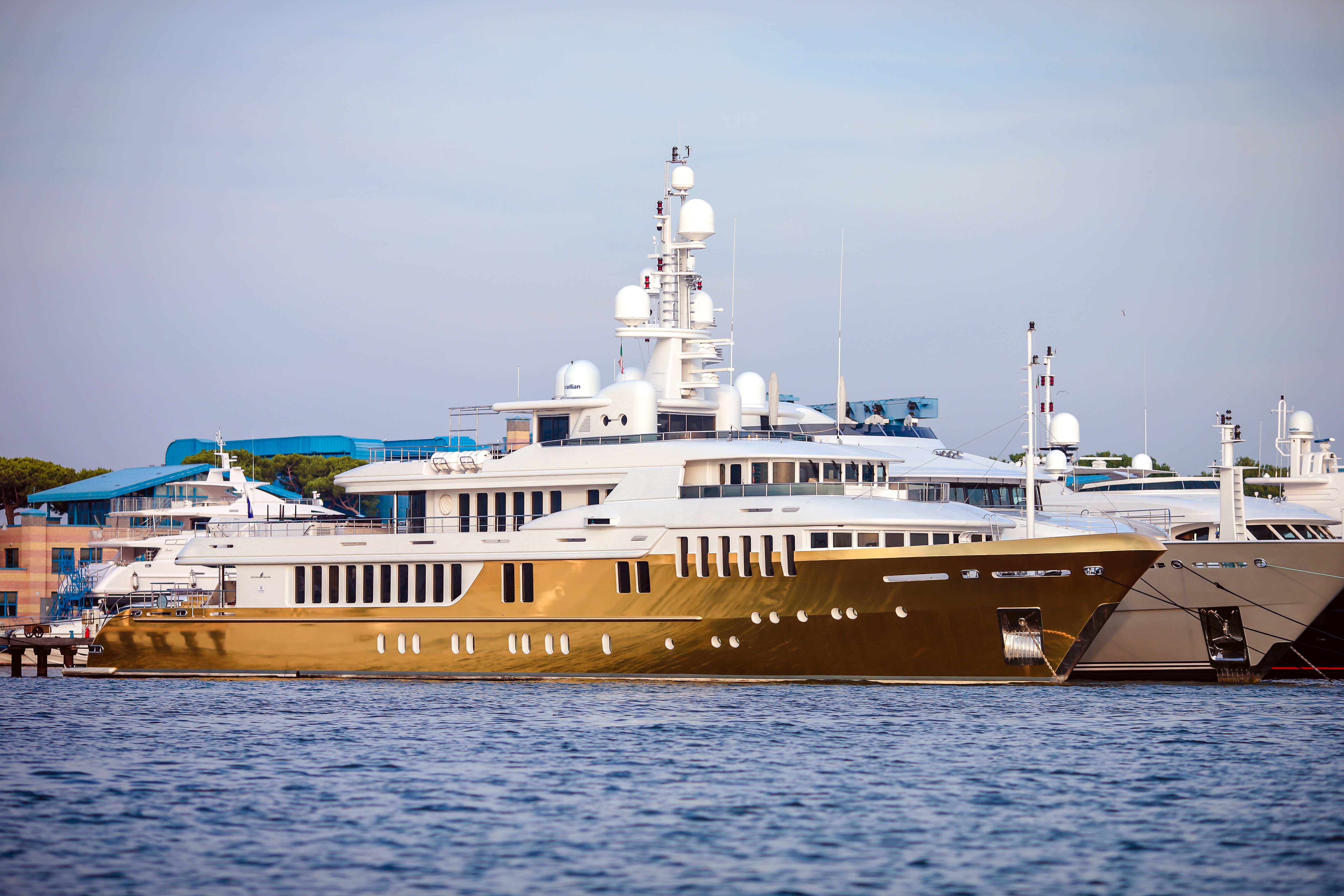 Turquoise Yachts's 53.2m/174.7ft motor yacht BELLAMI.COM has completed a vinyl wrap - an alternative to a hull repaint - and now sports a reflective golden hull from LuxWrap in time for an appearance at London Fashion Week.