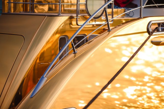 Charter yacht BELLAMI.COM (ex.KINTA, VINYDREA) has recently completed a transformation to her exterior, changing from a pristine white hull with matching superstructure to a fashionable reflective gold appearance thanks to vinyl finishing company LuxWrap. She now is ready to take her guests on private yacht charters in the Mediterranean for the rest of the summer season.