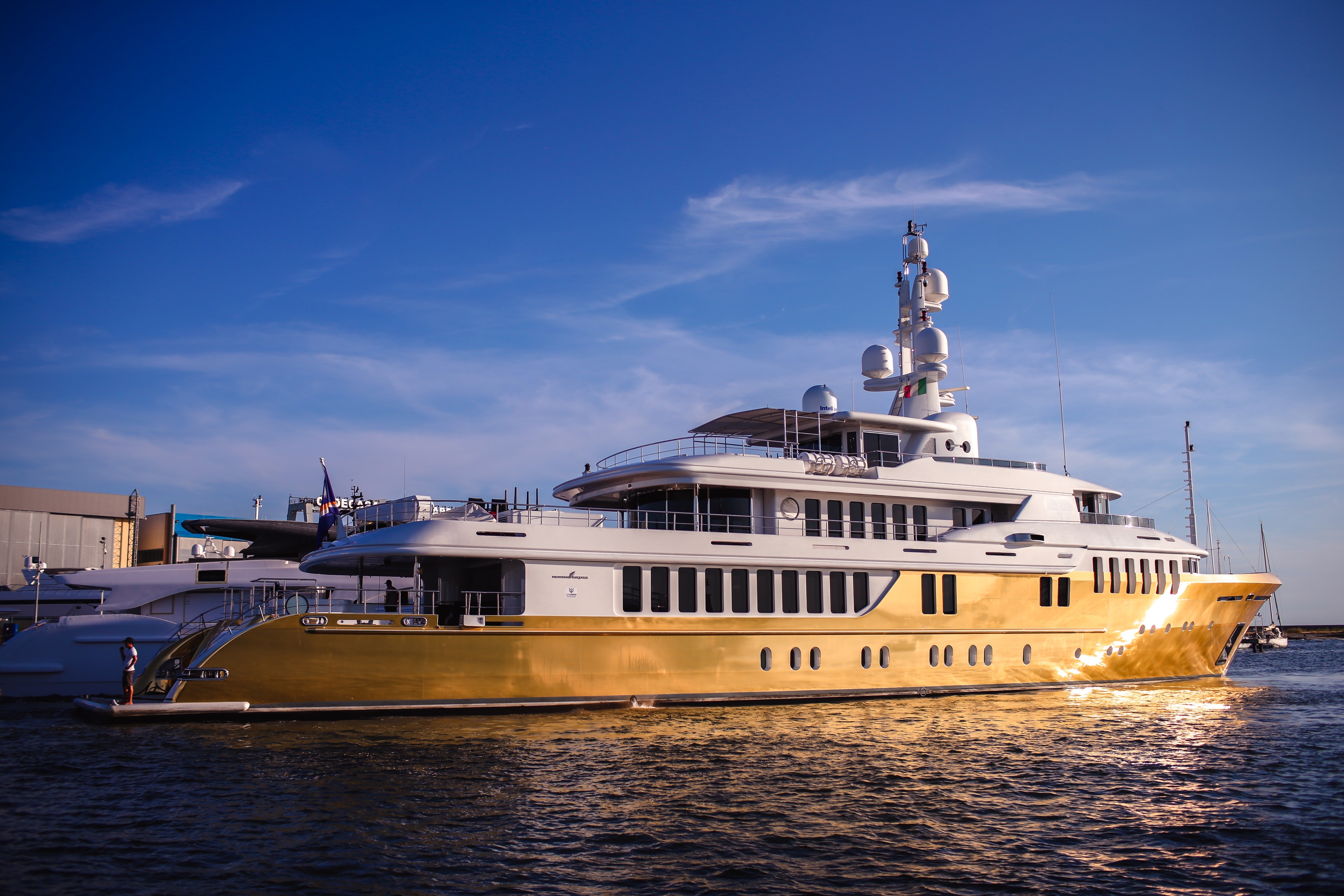Although the alternative to a repaint has been done before on smaller vessels and vehicles, the size of 53.2m/174.7ft BELLAMI.COM (which was named after the American hair extension company) posed its own unique challenges in the application of 600m²/6458ft²of gold vinyl wrap: The process which was meant to be completed in 10 days ran over into 13 due to bad weather at Port Viareggio, logistics issues and when an upgrade of the jet skis to tenders also caused delays.