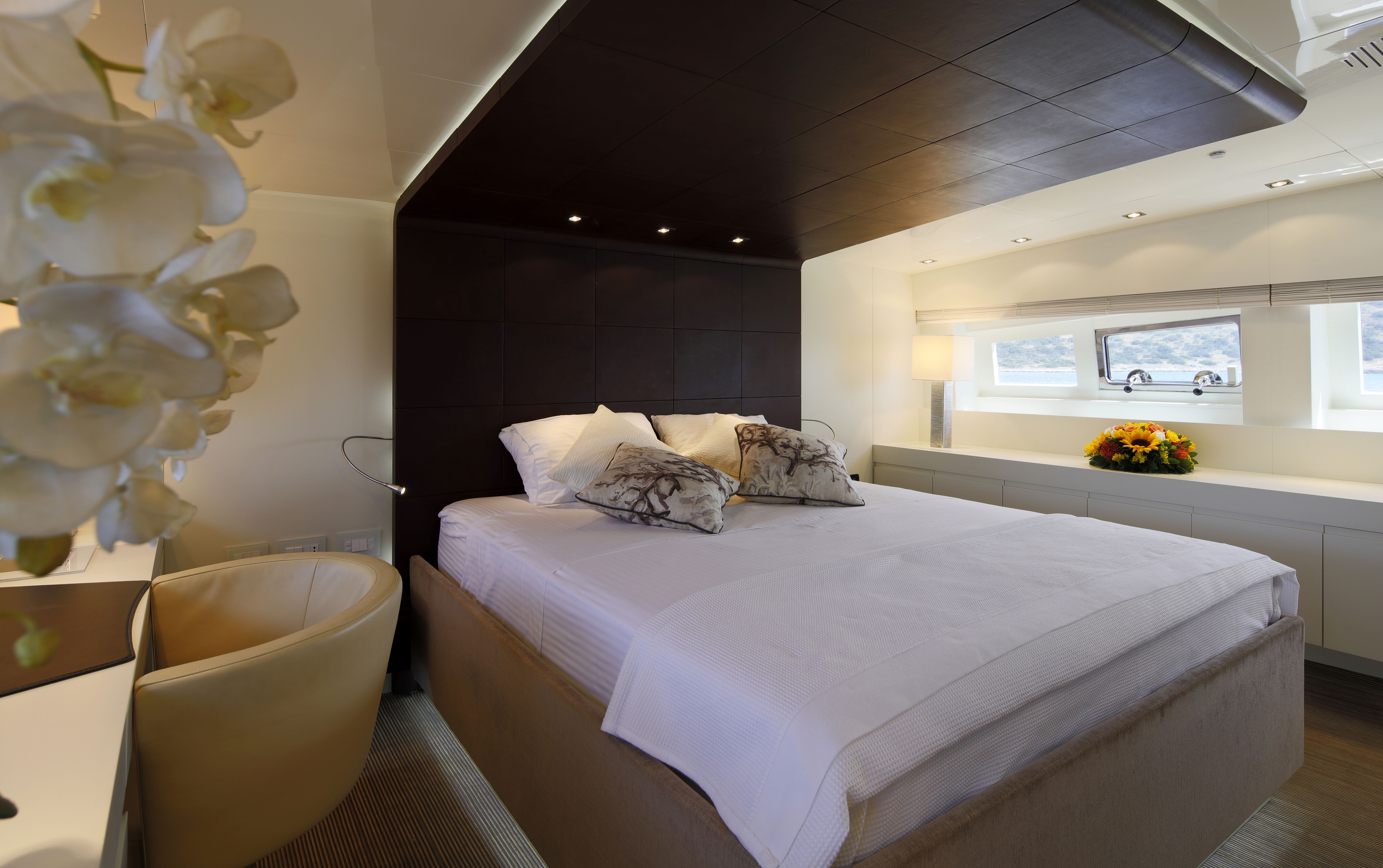 On the same deck, the master stateroom is located. It spreads the entire beam of the yacht and has been equipped with a private en-suite bathroom and other deluxe amenities. The remainder of the guests cabins is situated on the lower deck, with en-suite bathrooms.