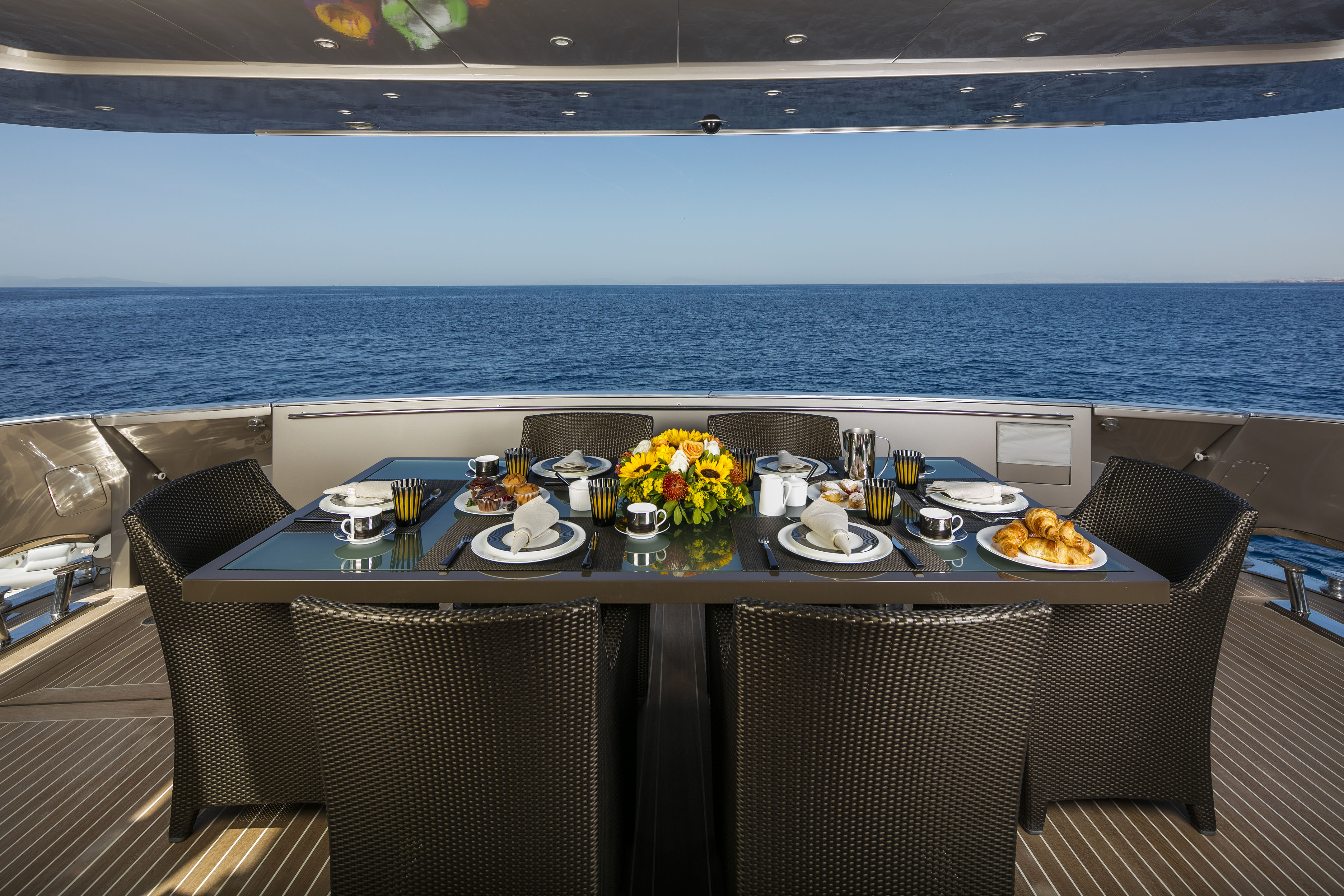 The saloon and the formal doing area are both located on the main deck in an open-plan setting. The lounge area has two comfortable opposing sofas, ottomans and an entertainment system. This area is separated from the dining area thanks to a large island credenza. Both the elegant dining space and the lounge area are surrounded by large windows allowing fabulous views and a large amount of natural light to penetrate the interiors.