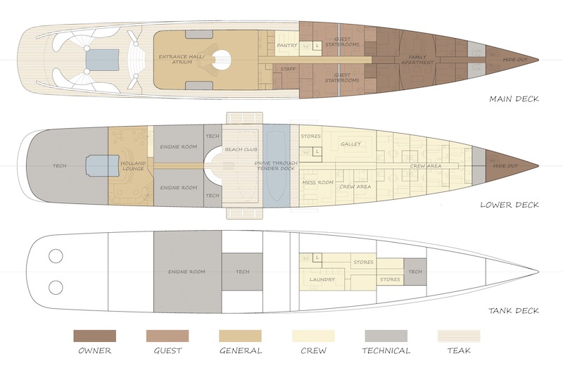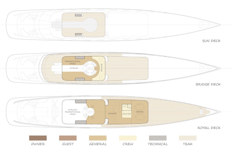 Another major section of the meticulous layout is the private owners’ apartment forward on the main deck, featuring a lounge and four staterooms. When the royal couple have time for themselves they can snuggle down in their very own all-glass three-storey hideout in the bow. A royal yacht should respect the environment. On superyacht Feadship Royale electrical power comes from two medium-speed 2000kW diesel generators. She would already meet the IMO Tier III and EPA Tier 4i regulations – due to come into force in 2020 – without requiring after-gas treatment.