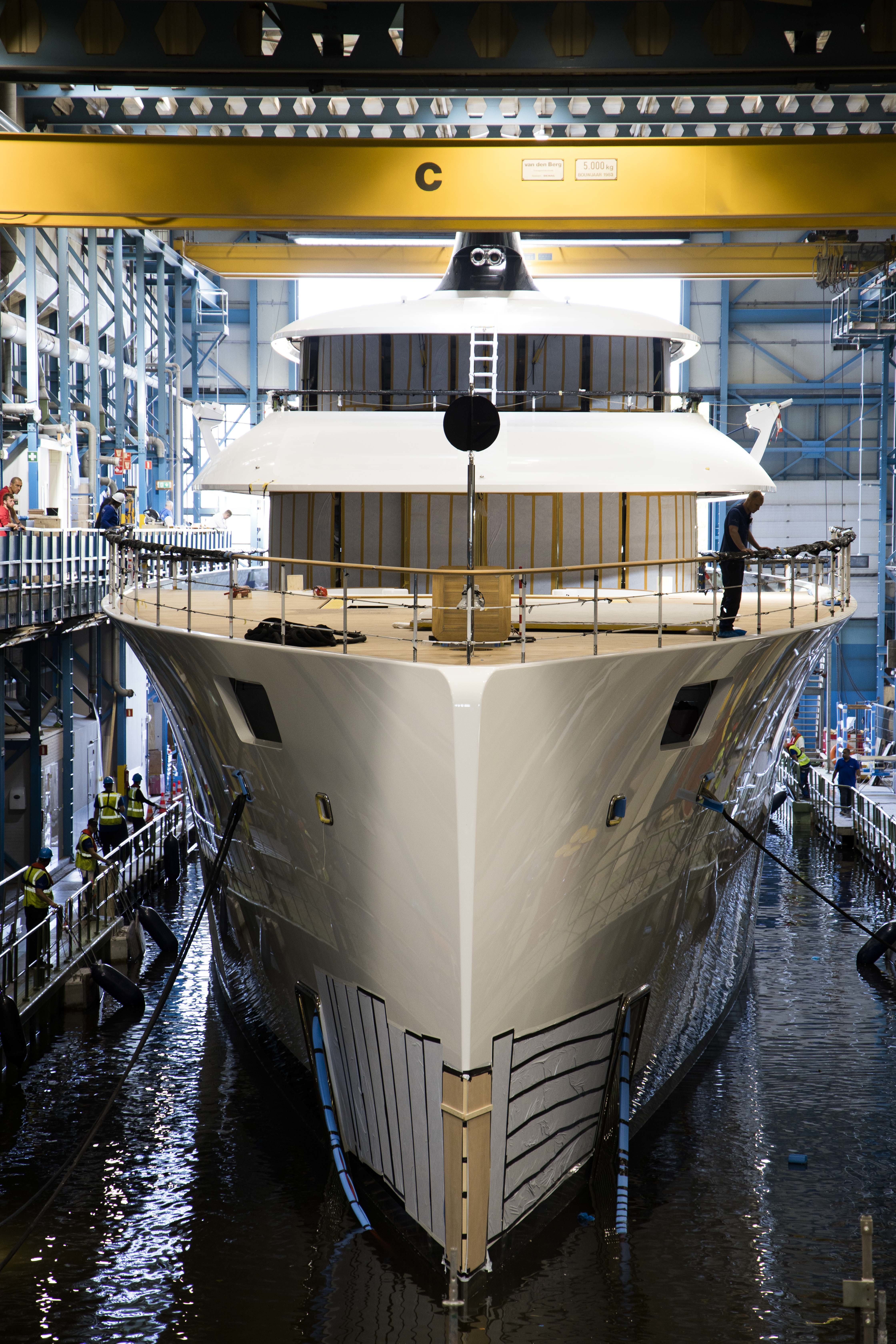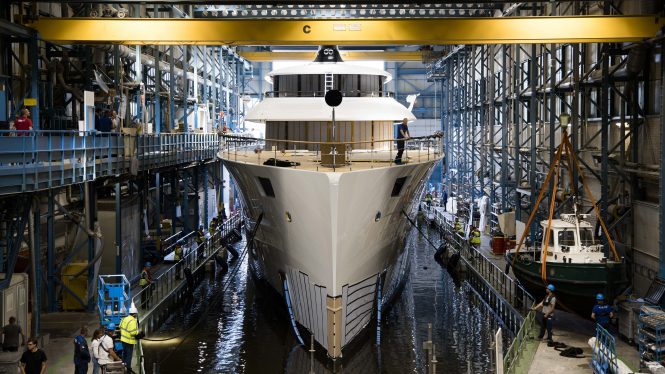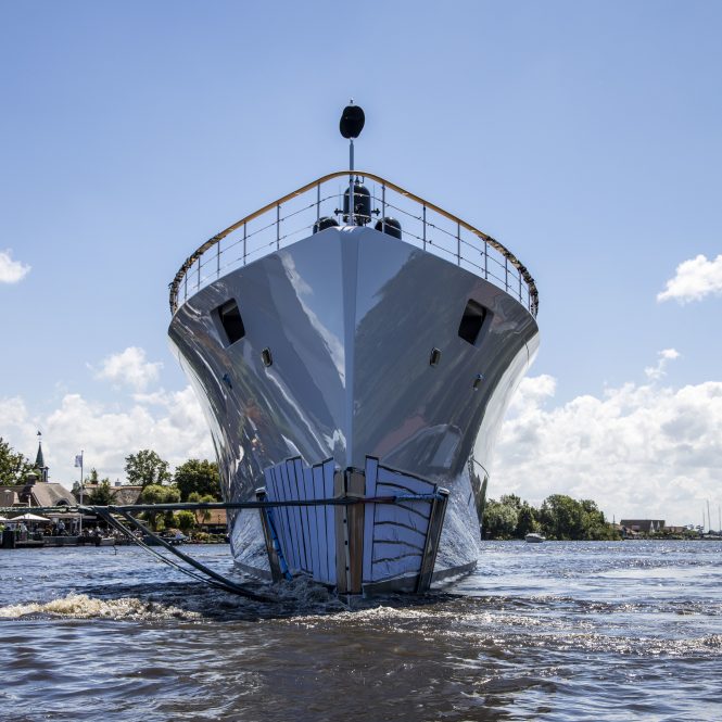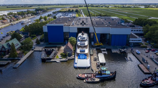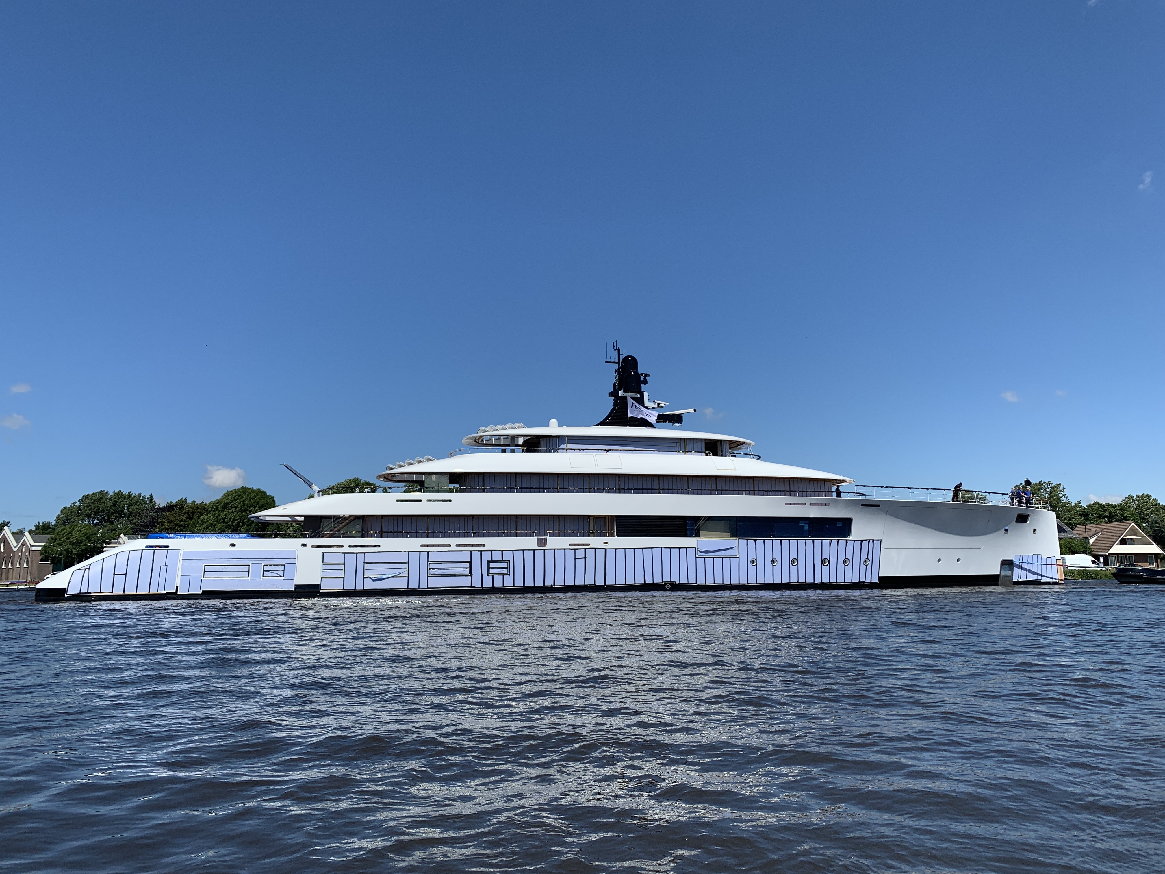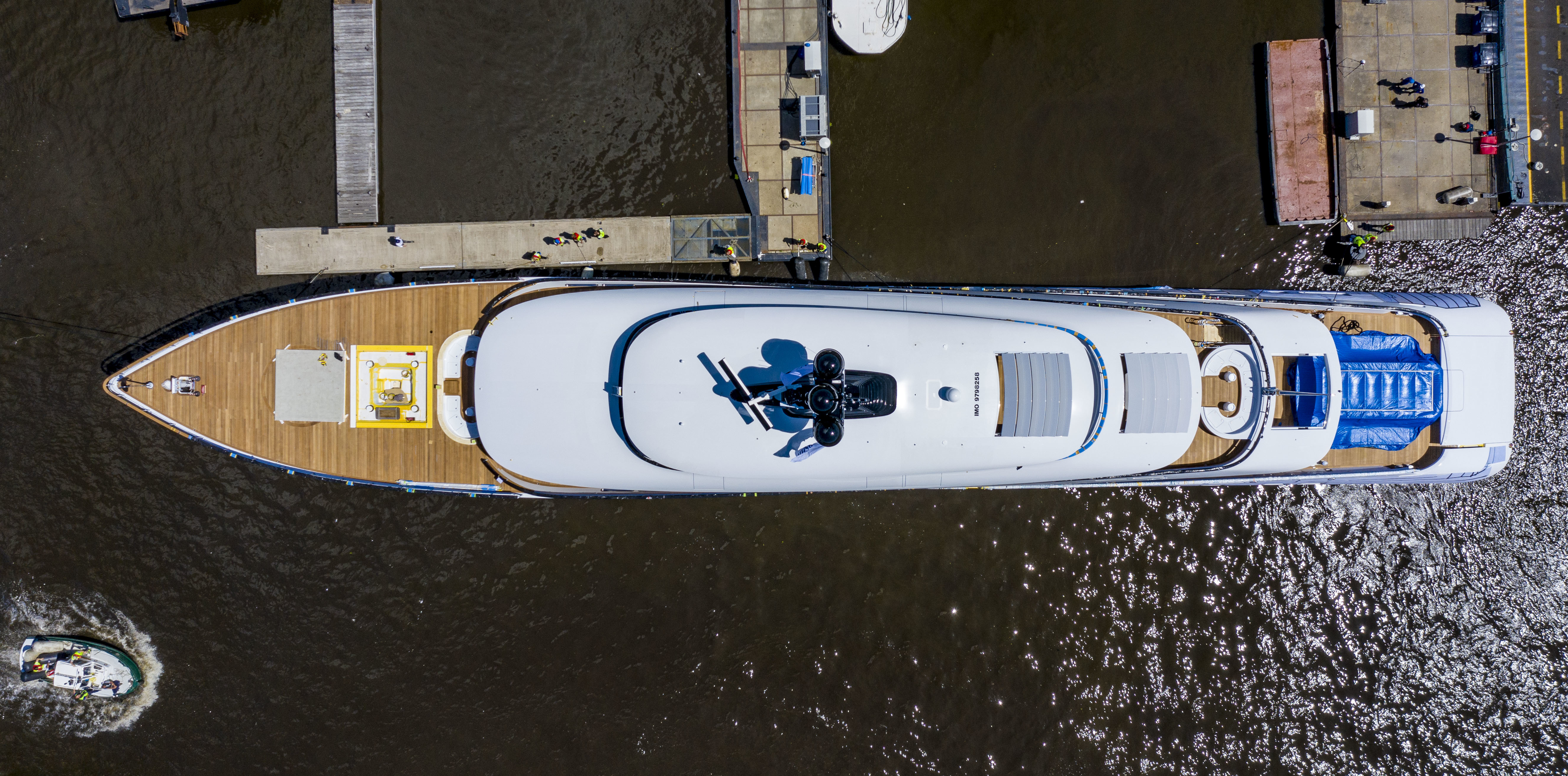 The new and imposing 77.25m superyacht was revealed by Feadship yesterday. PROJECT 818 emerged from the shed at the Feadship facilities in Kaag. Thousands of Feadship fans tuned in to watch the first ever live broadcast with some excellent drone footage.