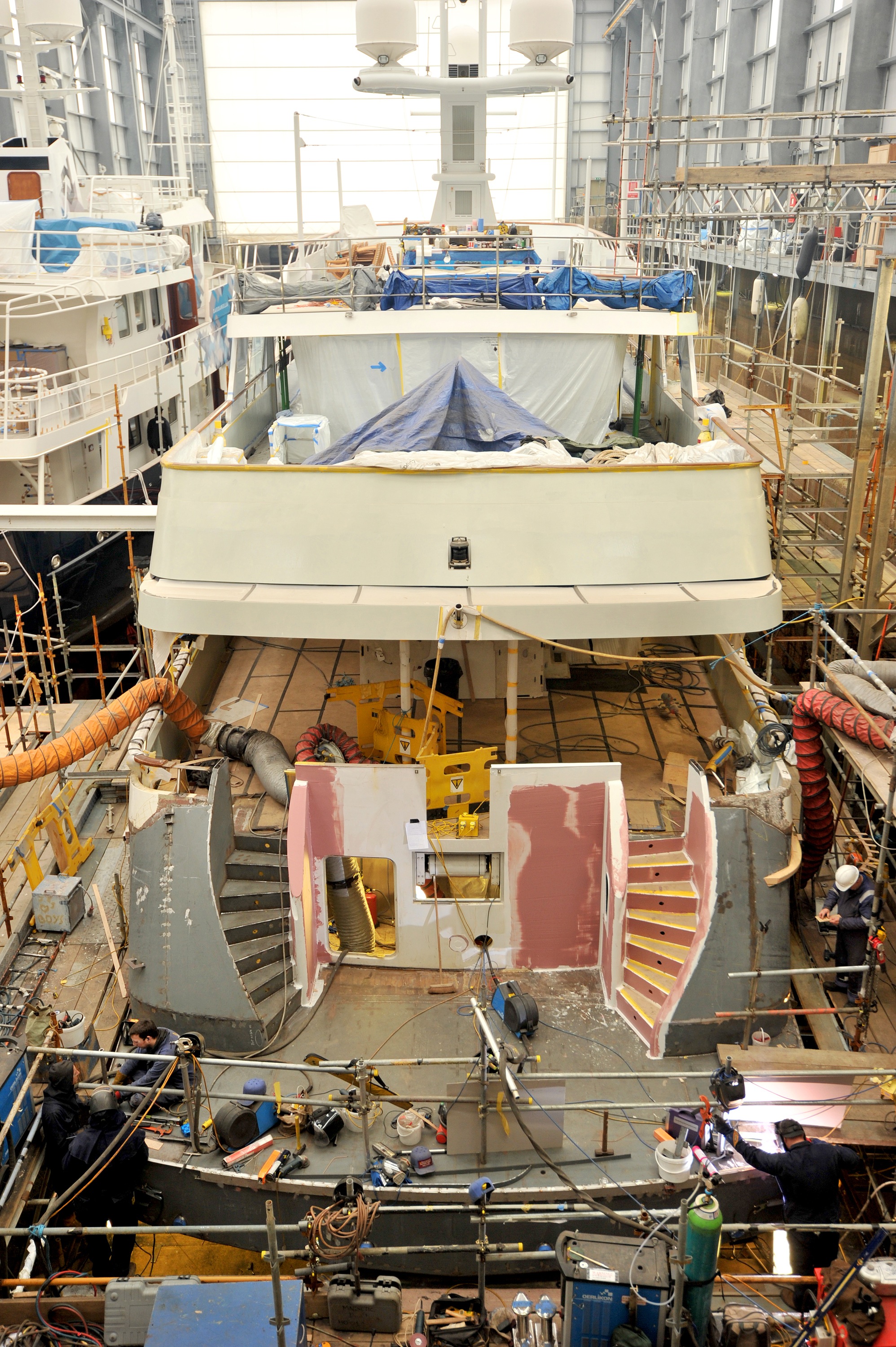 To facilitate the short build schedule the project team devised a programme to allow trades to work alongside each other on different elements of the project. For example whilst the fabricators were taking the stern back to its original lines, the engineers were simultaneously dismantling the stabiliser system. Work commenced on preparing for the new double sweeping stairways to be fitted whilst another team worked in parallel forming the shell plating to precisely match the curves of the existing hull. At the same time the forward fashion plates on the main deck were cut out.