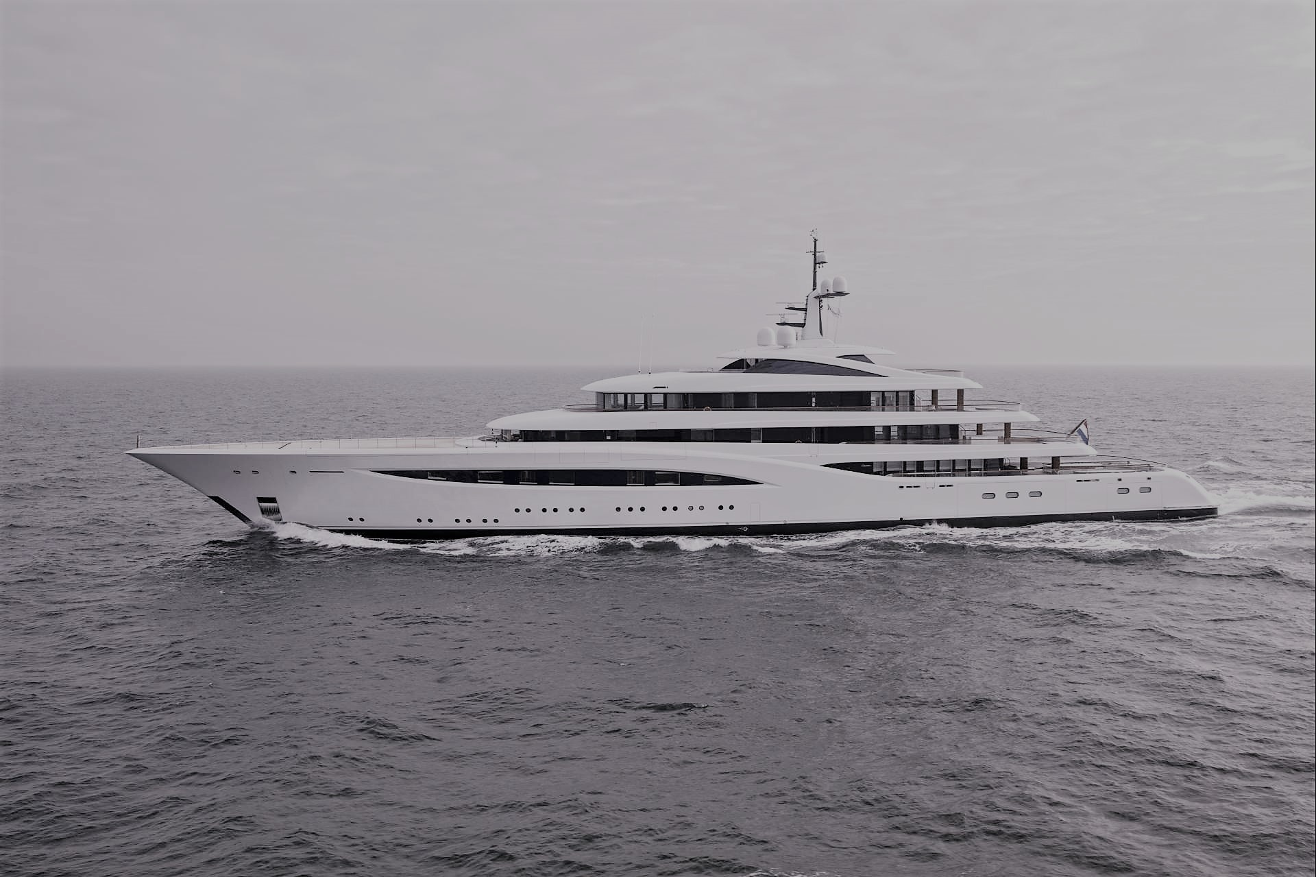 The sweeping hull line leads down and aft towards the main deck aft, home to a revolutionary swimming pool made of glass panels that also form the ceiling of the beach club below. Creating this 68-millimetre-thick construction involved laminating together five layers of clear glass interspersed with foil.’