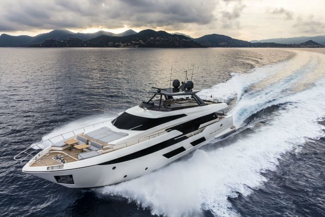 At 28.5m/93’6″ she features a flybridge which stands out due to the yacht’s wide body concept designed by the Ferretti Group’s Product Strategy Committee and Engineering Departmenet in bollaboration with Zuccon International Project.