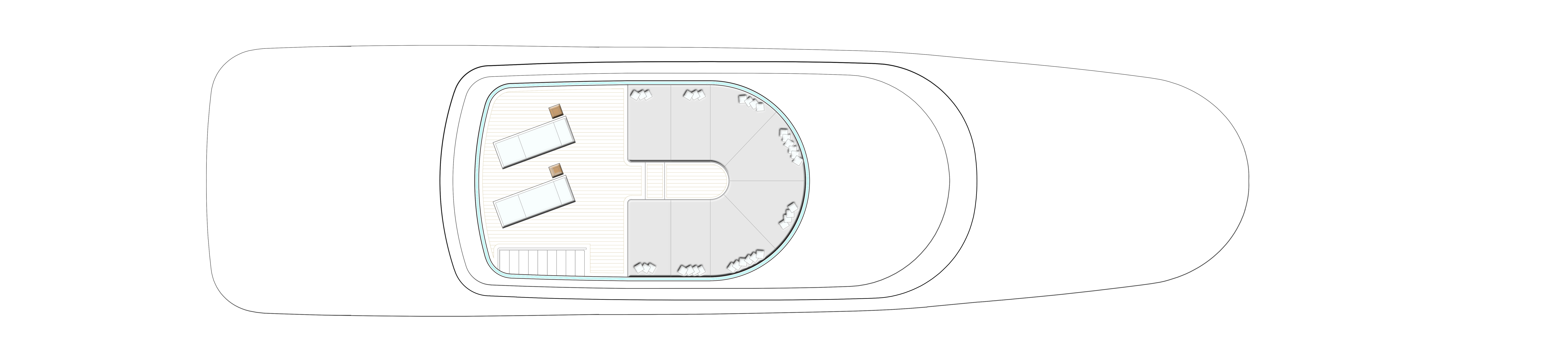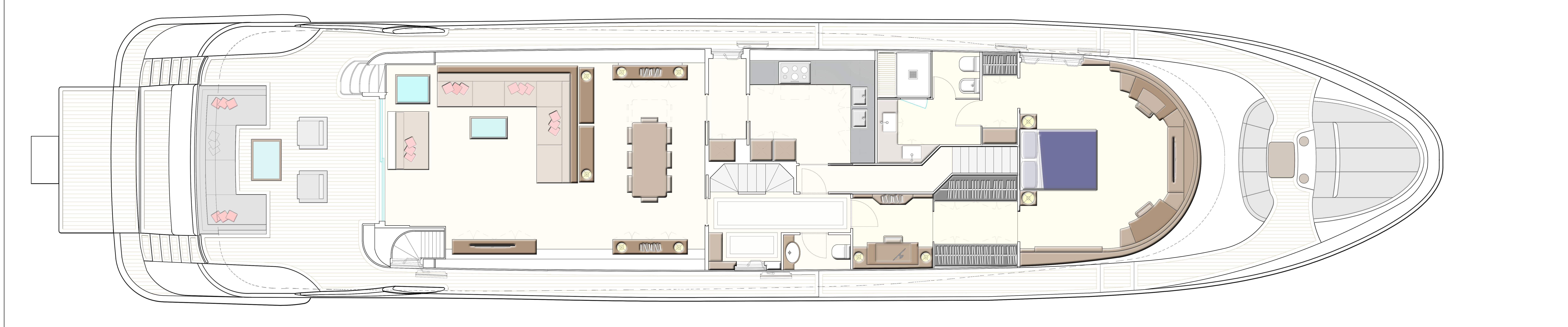 The main deck boasts a voluminous Onwer’s suite, equipped with an en suite bathroom and a wardrobe. An exclusive main saloon and the exterior dinette are located at the stern offering private access for the owner.