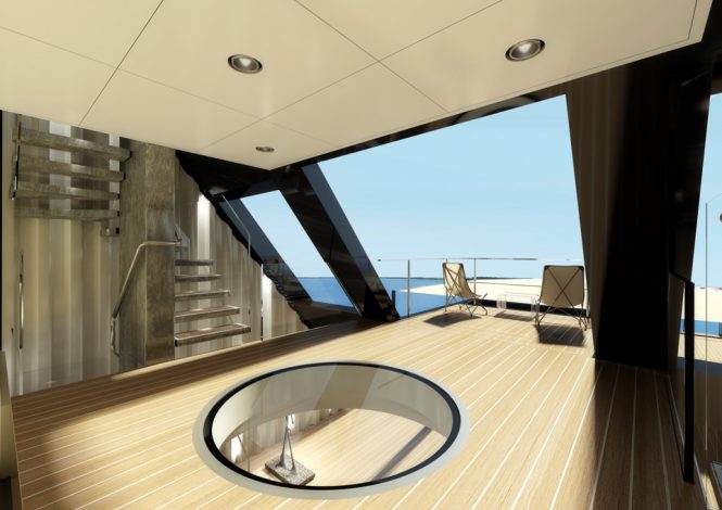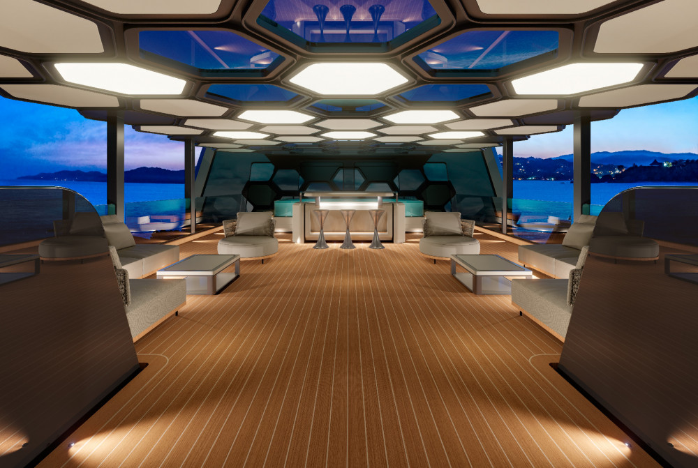The exterior styling was created in conjunction with famed Italian designer Francesco Paszkowski and is immediately eye-catching in her appearance, featuring solar panels that shelter the helm station, fold-down terraces and spacious alfresco social areas.