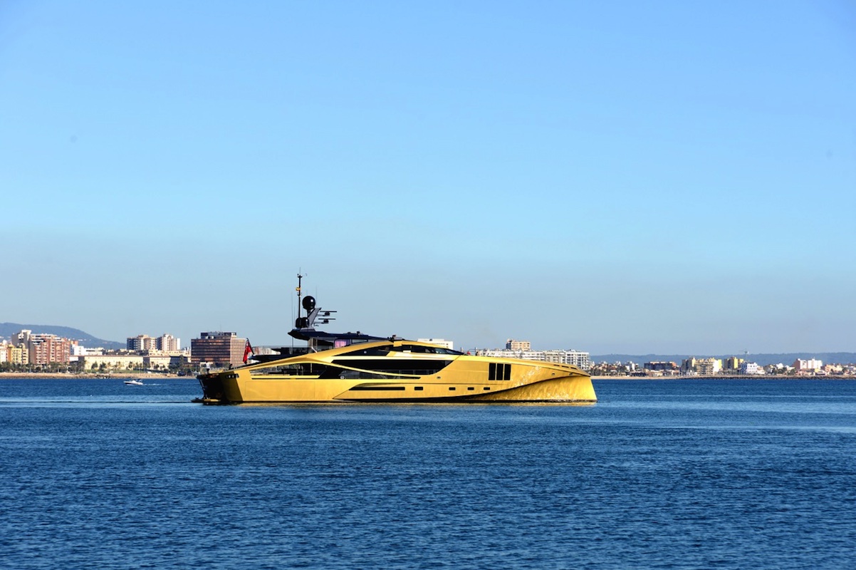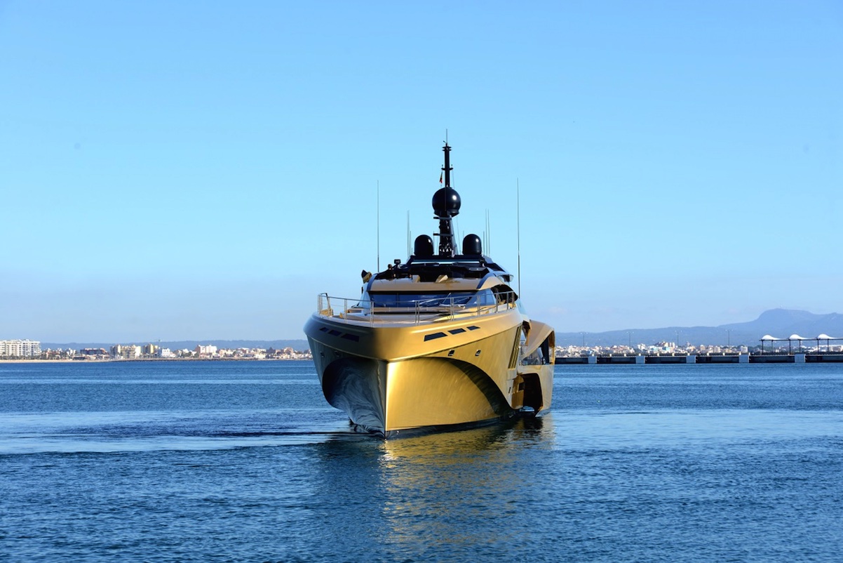 Thanks to her distinctively futuristic design and a generous 11-metre beam, the awe-inspiring gold KHALILAH is already stirring up the interest that was anticipated after the industry reaction to her first appearance in Florida earlier this year. She represents the third yacht that Palmer Johnson has constructed for the owner, all in the same custom gold colour.