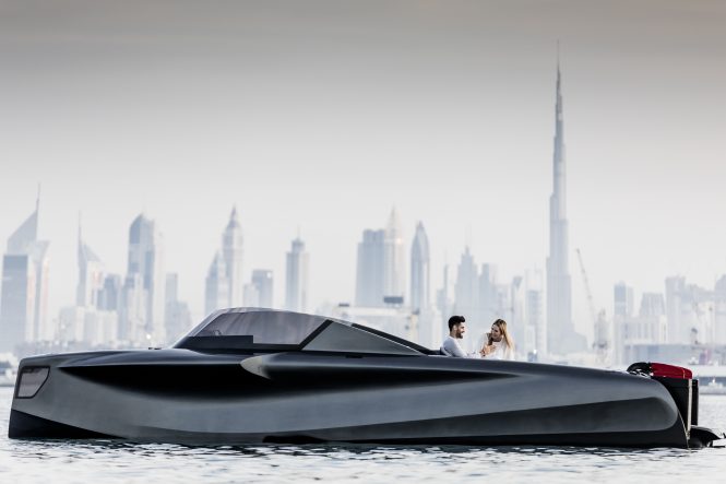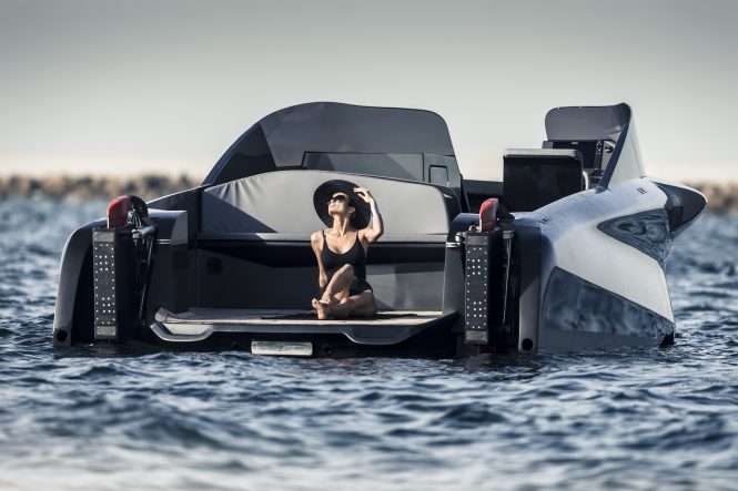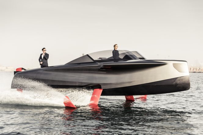 Built with retractable carbon fibre hydrofoils, the yacht flies up to 1.5m/5ft above the ground for a comfortable ride that avoids the swell that most conventional tenders hit when travelling at speed.