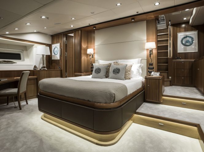 The accommodation layout is designed with privacy in mind and provides guests with everything they need for time to themselves in addition to the sensational shared guest areas. The 4 large en-suite cabins to sleep up to 8 guests: 1 Master suite, 2 double cabins and 1 twin cabin. The Master suite to the stern can be accessed directly from the swim platform and makes use of the full beam to give its occupants a king-sized bed, a widescreen TV, a sofa and a desk/vanity in addition to plenty of storage space and an en-suite bathroom with two sinks, a toilet and shower.