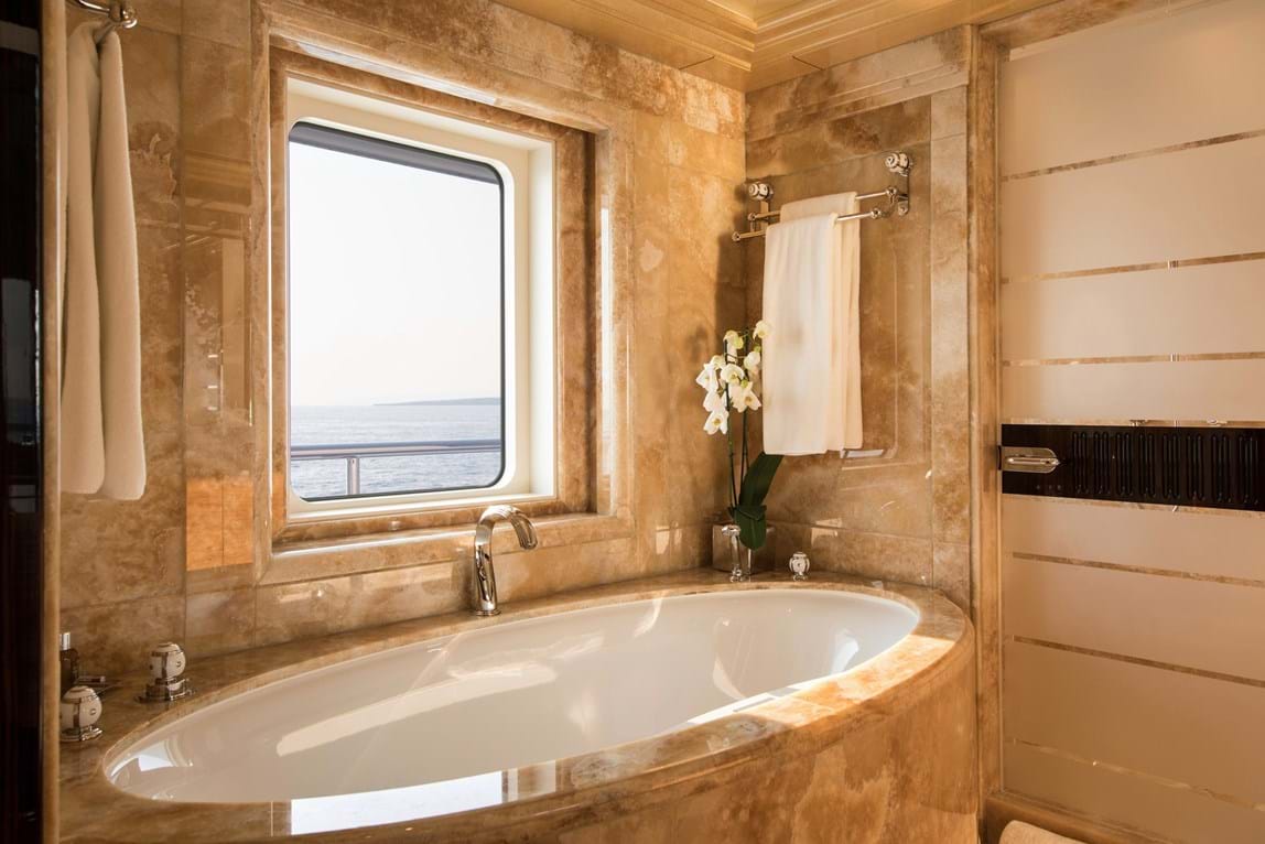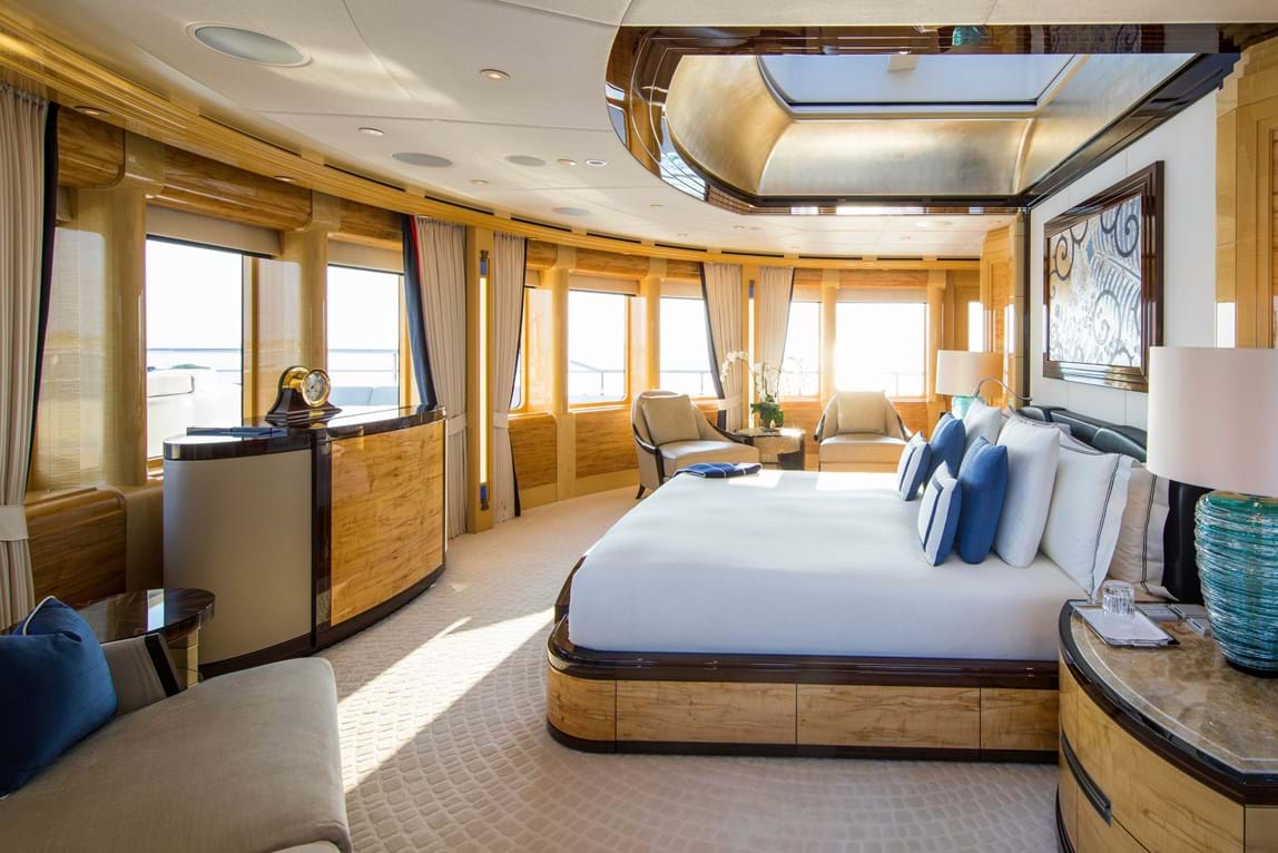 The Master suite is placed on the upper deck forward and benefits from 180° views and a large skylight above the bed. Sofas furnished the space along with the king-sized bed and pop-up widescreen TV to give occupants plenty of entertainment options while unwinding in privacy. The his-and-hers en-suite bathrooms both provide walk-through wardrobes and a Jacuzzi bath. There is an office behind the Master suite and forward, the occupants have their own private alfresco lounge and Jacuzzi.