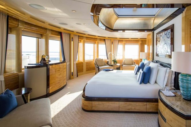 Reymond Langton Design went for timeless elegance to suit any occasion suing subtle art deco elements in the furniture and fittings. The grain of different kinds of wood is shown off to striking effect in both the private and shared areas, and consists of maple, fiddleback sycamore, stained anigre, Macassar ebony and golden burl. This beauty is incorporated into function as well as form, as seen in the spiral staircase encompassing a glass lift (elevator) that connects all the decks.