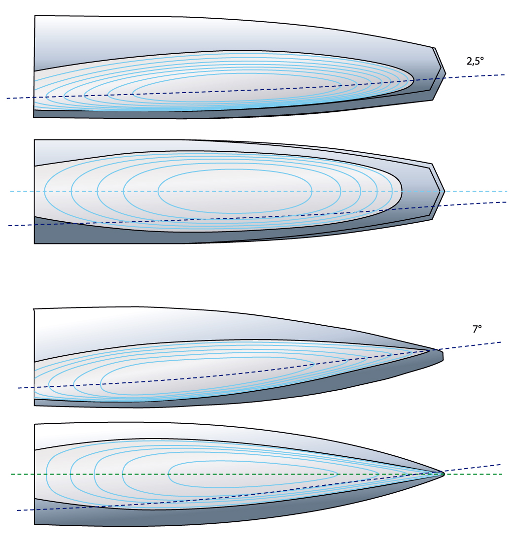 “As featured in the wetted surface diagrams comparing the MScow concept with conventional monohulls when heeling, the key advantage of the MScow is her underbody, which under a heel sails at an angle which would be three times smaller than a conventional yacht. On the one hand, the righting moment is a lot more efficient, whether or not she is fitted with a canting keel, and on the other hand, the keel remains in the centerline under sail: The result is the MSow’s better ability in pointing to windward, by one or two degrees depending on configuration.”