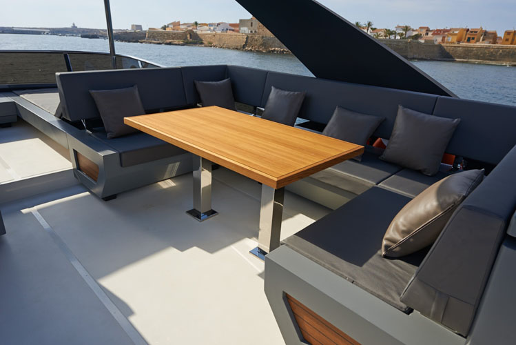 The flybridge of luxury yacht Astondoa 80 GLX features a top class BBQ grill, the top deck offers comfortable tanning beds, while the aft teak deck hosts U-shaped seating and a teak table, which lowers electrically to form a sun pad. Moreover, there is a well sized swim platform and garage that can easily accommodate a tender and many water toys.