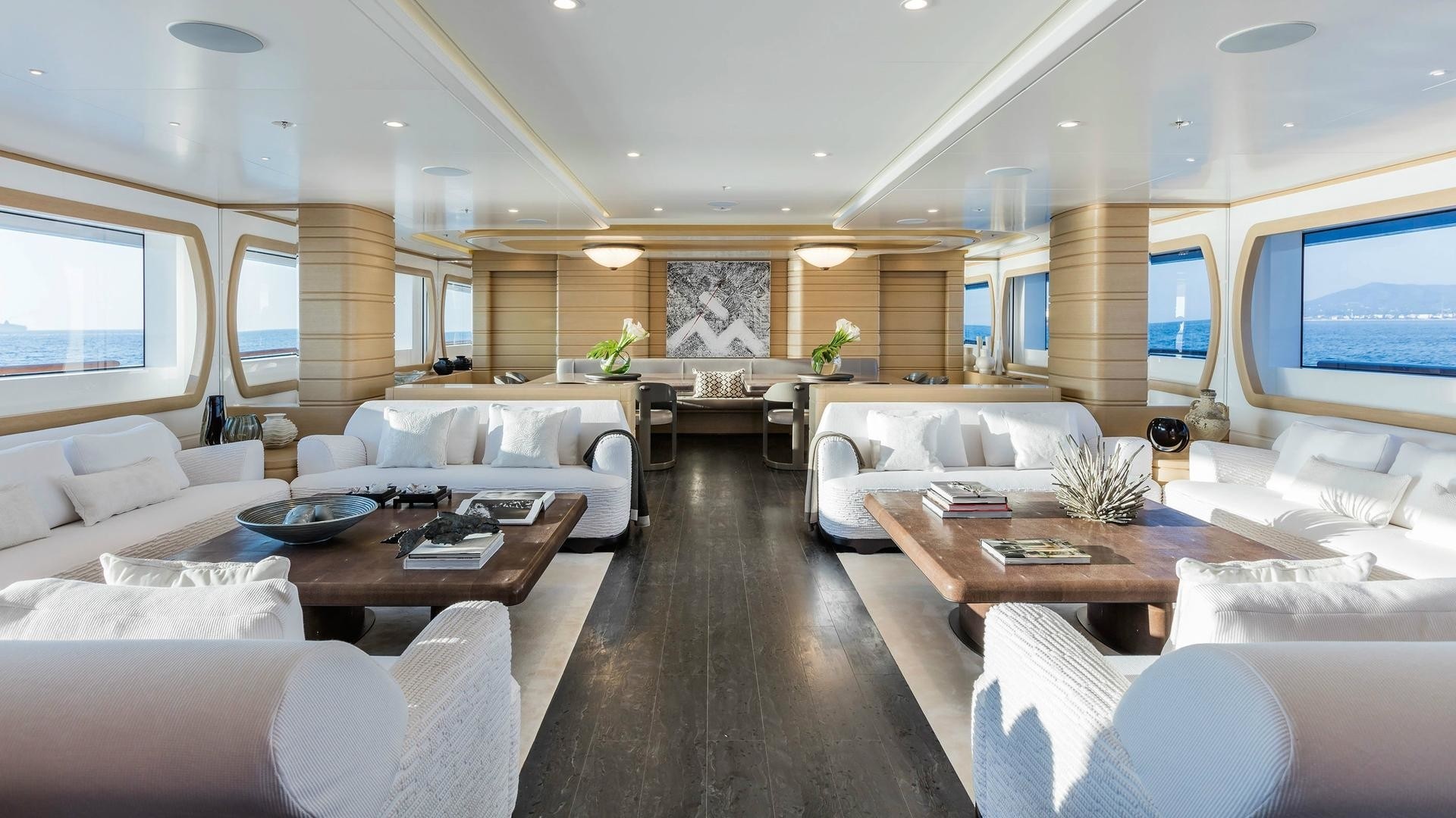 Her stylish contemporary interiors have a timeless atmosphere and inviting relaxed yet elegant ambience. An open-plan main salon with formal dining features plenty of seating, a cocktail bar, large panoramic windows and excellent natural light. Included on this deck are 2 VIP suites situated forward. On the bridge deck is a well-appointed master stateroom, offering a full beam layout, private study, large ensuite and walk-in wardrobe. Further accommodation is located on the lower deck, comprising 1 double, 1 triple kids cabin and 2 twin suites.