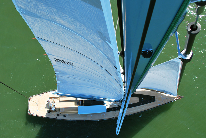 The superstructure strikes the eye, also because the rest of the deck has been kept clean and flush. The metallic ice-blue colour of the exterior of the superstructure has also been used to spray the 33 metre long carbon mast and Park Avenue boom. The deck is covered with teak, light grey rubbered, similar to the colour of the mast and superstructure. The cockpit is wide and long.