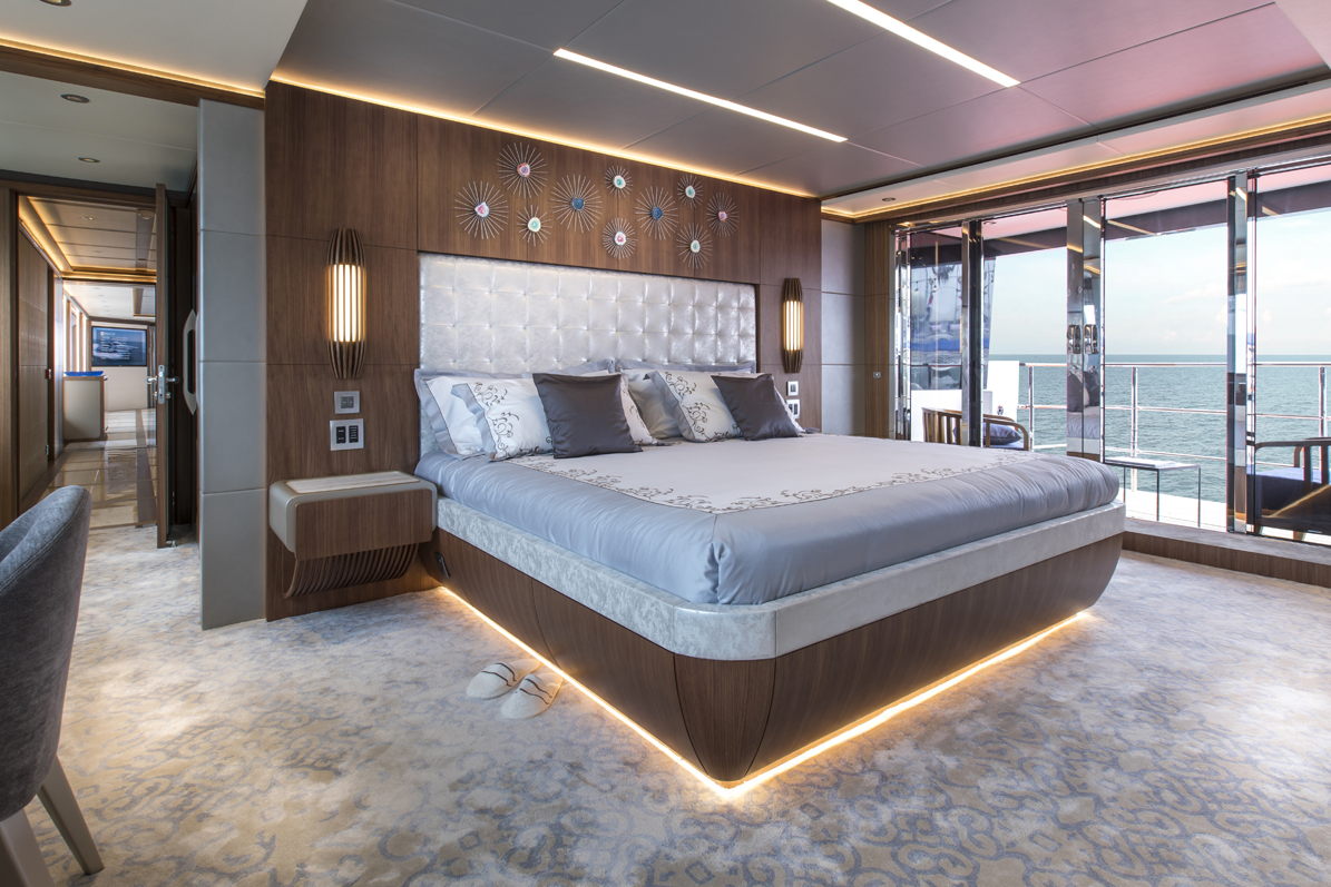 The Master suite is placed forward on the main deck and has its own private fold-down terrace, office and en-suite bathroom with bathtub, and a double en-suite cabin receives excellent views forward of the upper deck sky lounge.