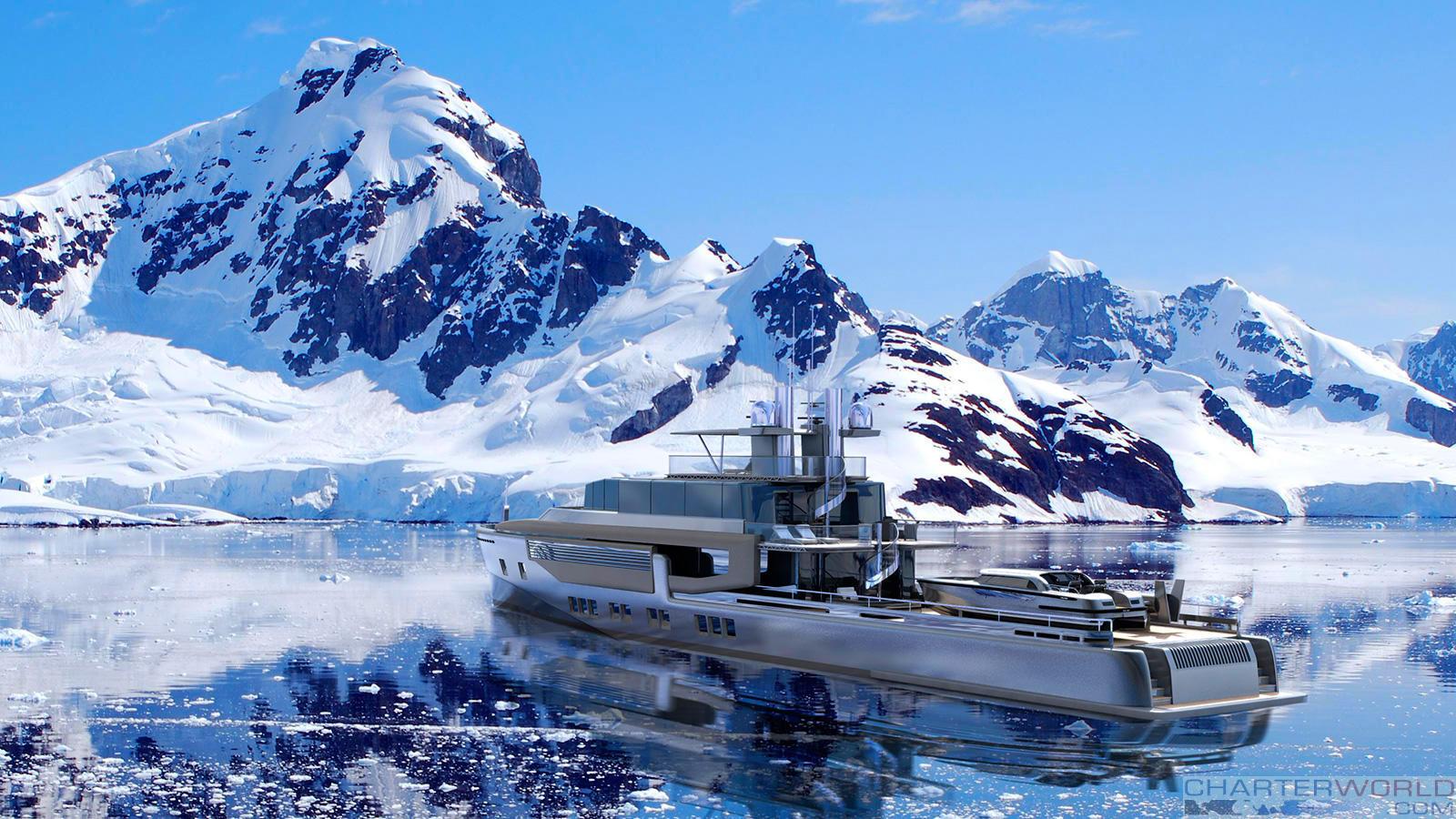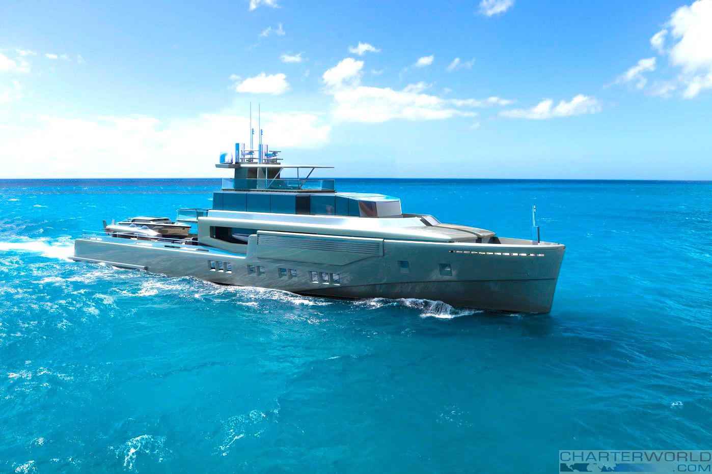 Spacious areas for storing tenders and toys is a great feature of this explorer yacht/support vessel.