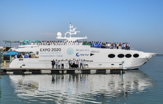 The premier Middle Eastern luxury yacht builder, Gulf Craft, has congratulated the Dubai Expo 2020 team to their glorious victory. The World Expo 2020 will be hosted by the United Arab Emirates in the fabulous yacht charter destination – Dubai. The shipyard demonstrated its ardent support for the UAE’s bid by flying a flag supporting the Expo 2020 Dubai bid aboard its Majesty 105 yacht.