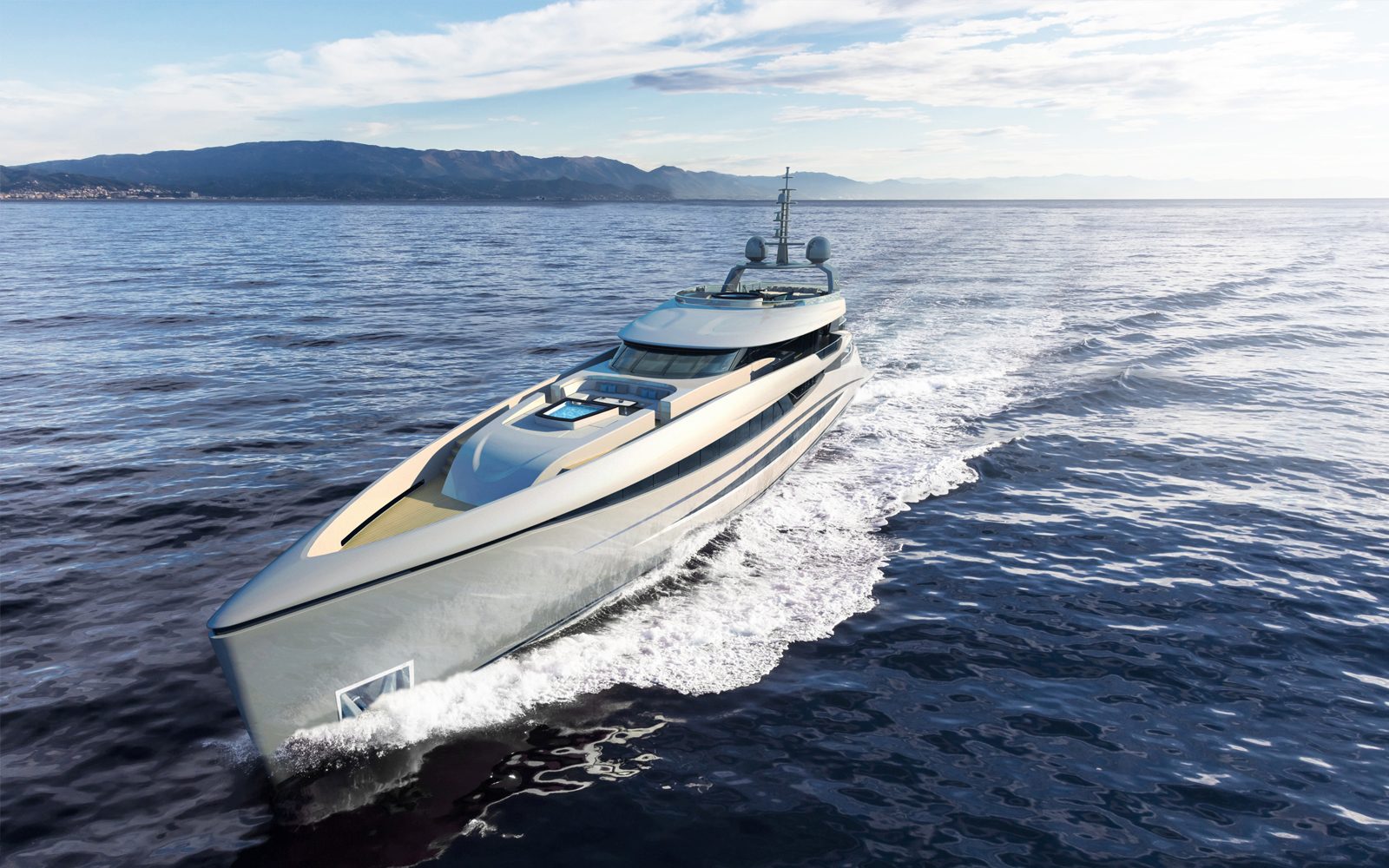The main theme of the concept is integrated balcony structures, which has been presented in Lurssen superyacht Jupiter, recently launched in late 2016. The lengthen yacht silhouette is achieved by continuous lines that add to the sense of motion and energy. The functionality of additional exterior living spaces is provided by balconies on bridge deck, which extend aft from the wings stations.
