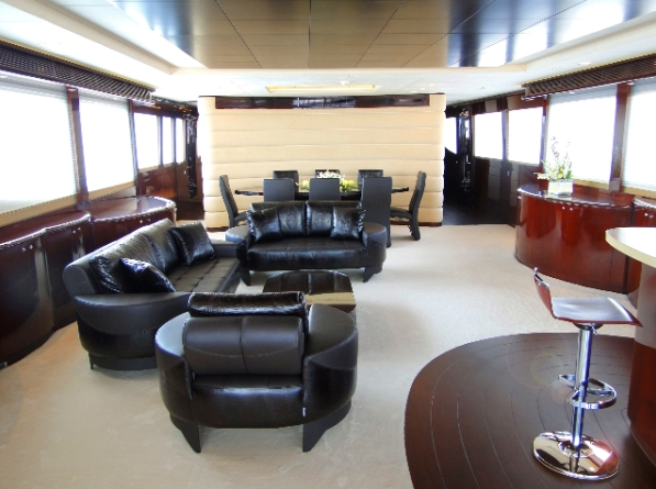 Of course, luxury superyacht DREAMER invites you to enjoy meals outside, too. The aft sky deck is ideal, with Corian countertops large enough to stage platters and a teak Lazy Susan in the table. Before or after you dine, enjoy the beauty of the surrounding anchorage and the warm sunshine on chaise lounges or the full-beam sunpad. Head up to the fly bridge for more sun and relaxation, thanks to two settees with tables for 12, a custom six-person hot tub and sunpad, plus a bar and barbecue.