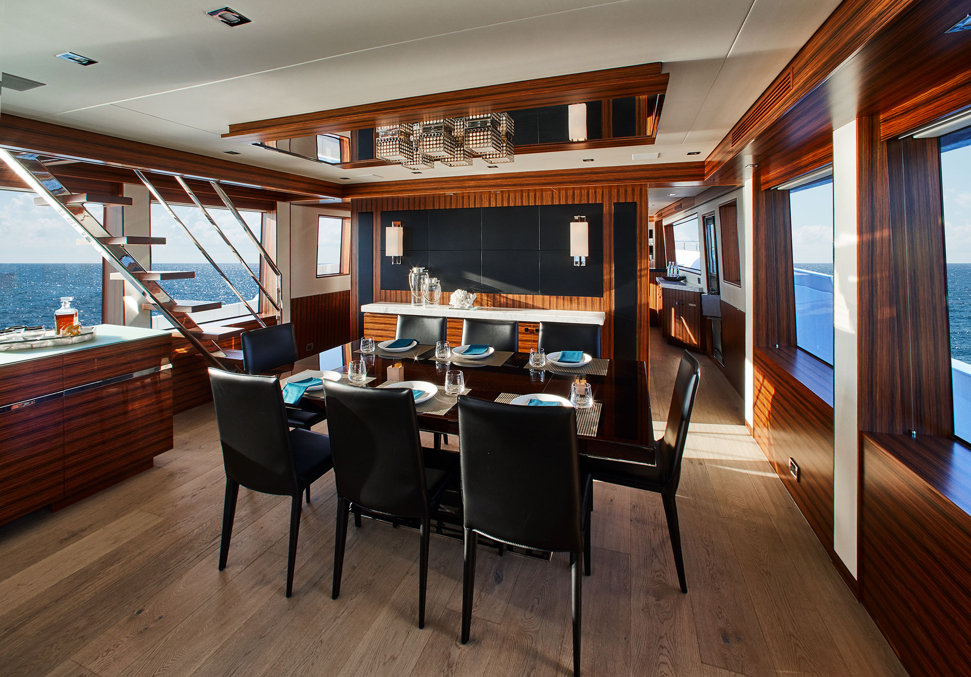 Luxury yacht M90 – Formal dining in the open-plan salon