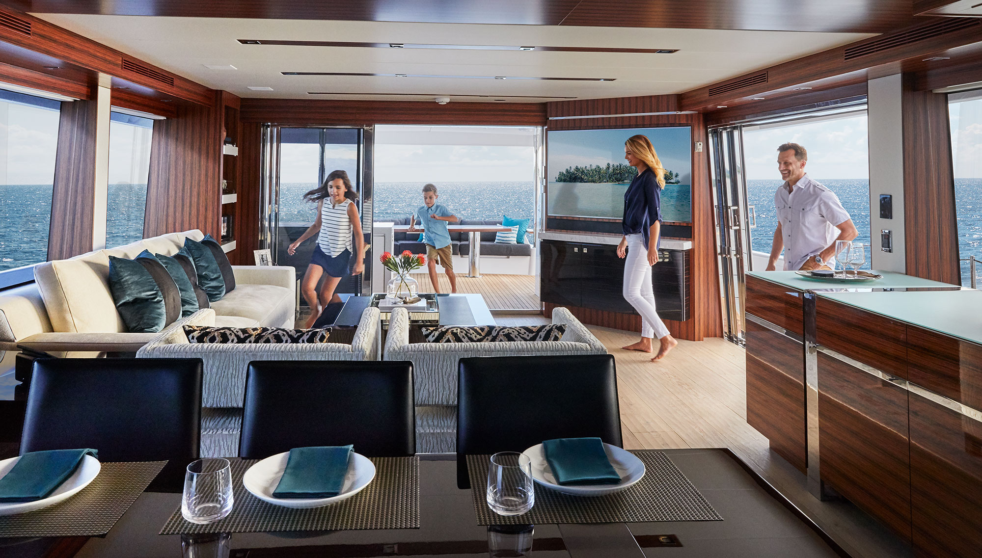 Designed for safety and efficiency while dining, entertaining and unwinding, the standard layout contains a forward galley with a salon and dining area, placing the open-plan salon and formal dining area towards the centre and aft.