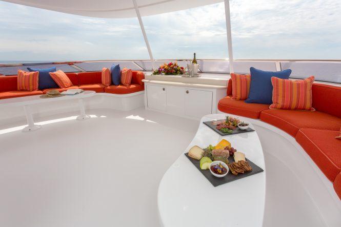 Both the main deck and upper deck connect to the forward Jacuzzi and bow seating area, where guests can ease tired muscles and unwind in the sunshine while enjoying greater privacy.