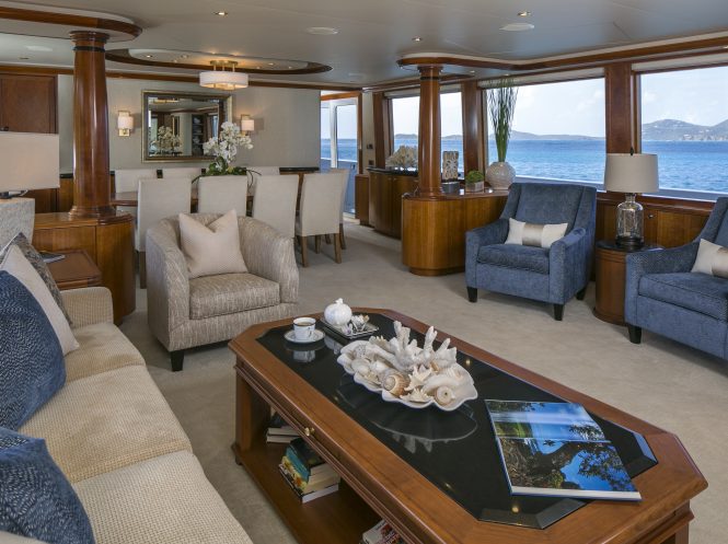 The main salon is a contemporary environment that uses wooden panelling and large windows along the length of the lounge and forward dining area to create an inviting and natural space where guests can unwind out of the strongest sun and heat during the day. Plush sofas have enough space for the whole family to gather around, and the on board games consoles will entertain the children while heading from one location to the next.