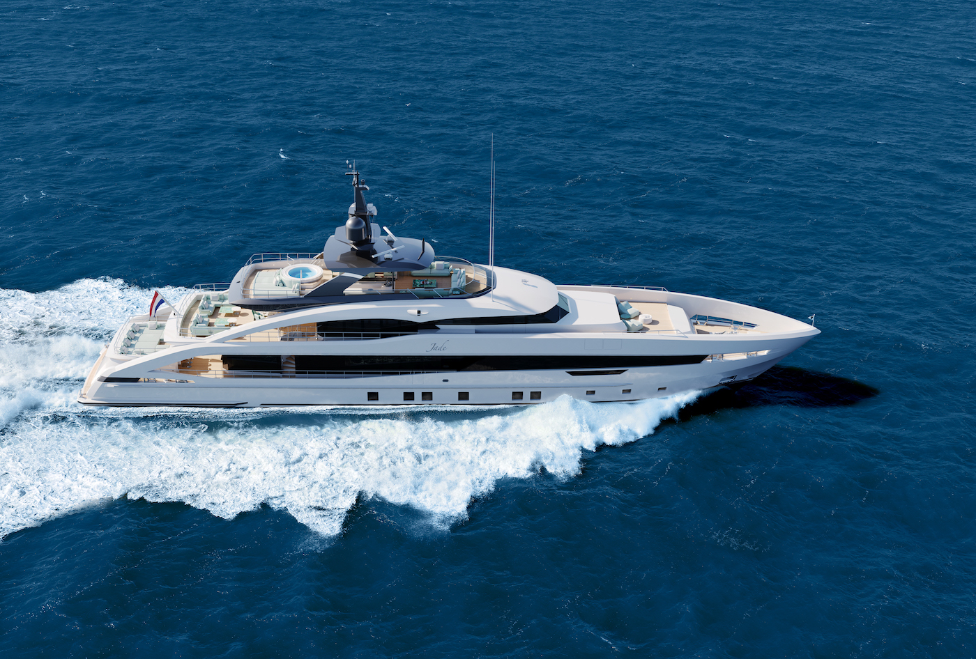 Luxury yacht PROJECT JADE can achieve top speeds of 23 knots from twin MTU 16V 4000 M65L (IMO Tier II) engines with a range of 3,100 nautical miles at her cruising speed of 11 knots.