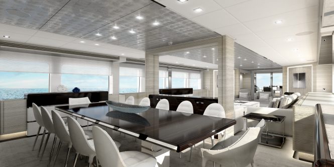 As the latest hull in the shipbuilder’s highly successful 5000 Aluminium series, PROJECT ASTER has naval architecture and exterior styling done by Frank Laupman of Omega Architects. Her semi-displacement hull was built by Heesen and using a pair of MTU diesel engines 16V 4000 she will achieve a top speed of 23 knots with a range of 3,100 nautical miles at 11 knots.