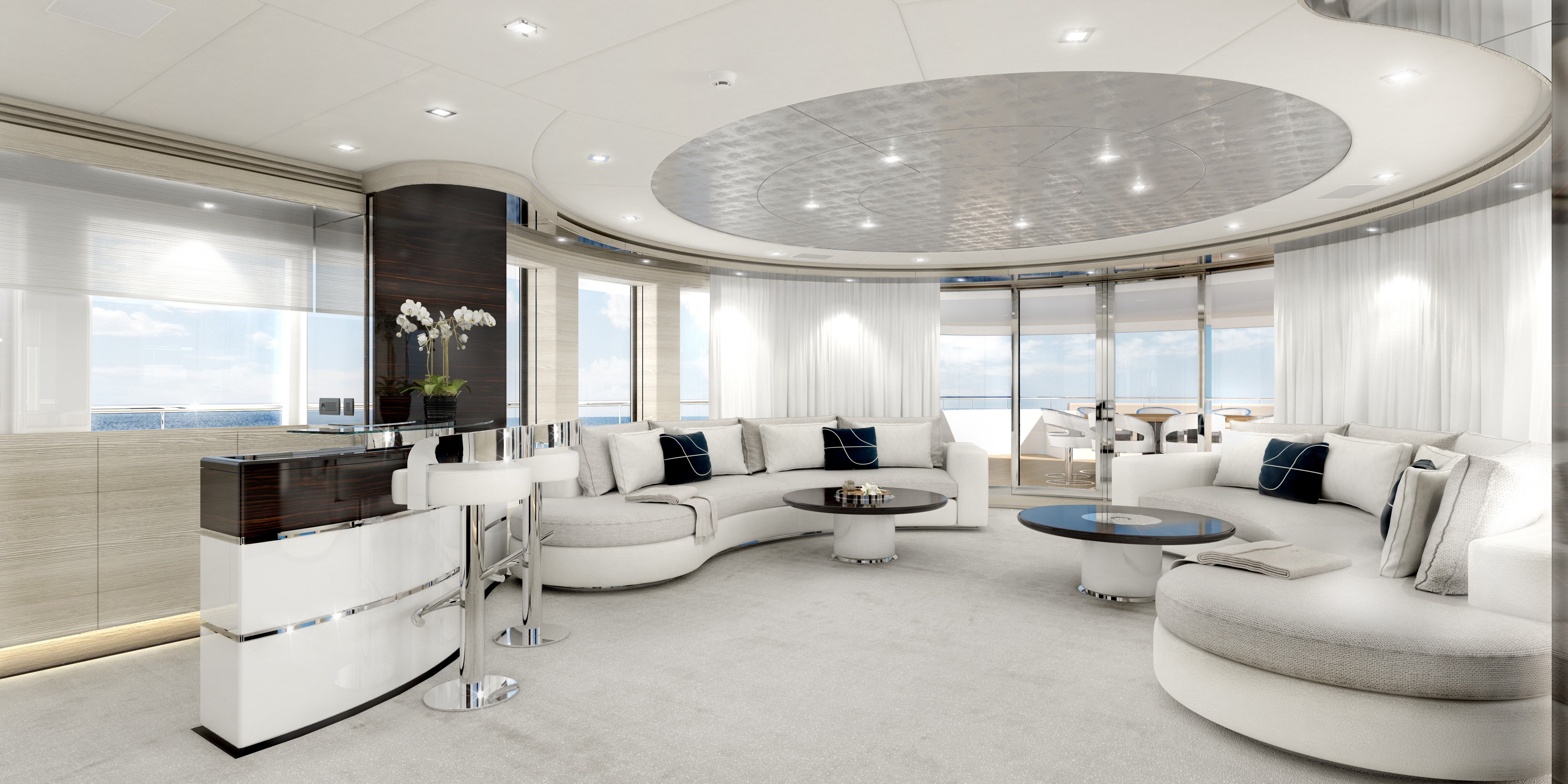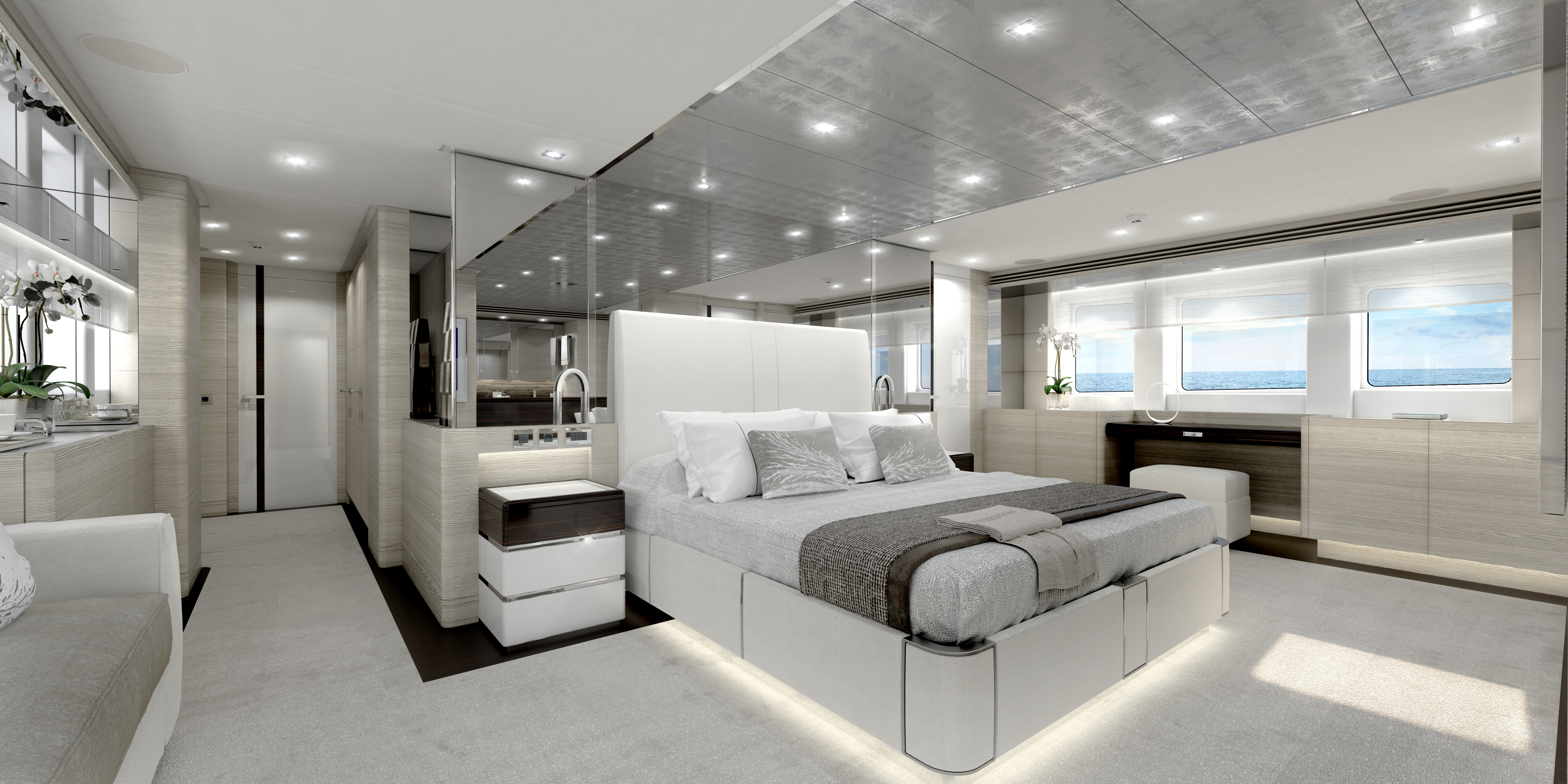 The interiors are styled by Cristiano Gatto Design, who chose a high lacquer wood finish against detailing in leather and steel to balance Heesen’s high-performance engineering and craftsmanship. Interior images of the main salon, sky lounge and Master stateroom reveal a pale colour scheme that uses ash white panelling with accents in steel, deep brown, pristine white and grey. Flowing curves are used in the furniture for a more organic setting and a multitude of half-height windows allow guests to enjoy the views while the natural light enters the room.