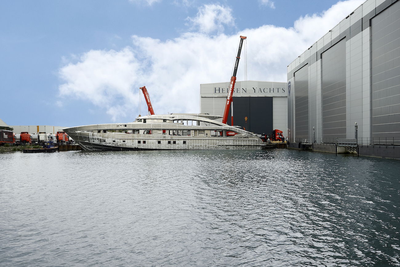 The renowned Dutch yacht builder Heesen has announced the joining of the hull and superstructure of YN 18950 superyacht Project Aquamarine, the first in the new 5000 Aluminium Class. The 50-metre full-aluminium yacht boasts sporty looks with curved lines, resulting in a sharp exterior design by Omega Architects attracting attention.