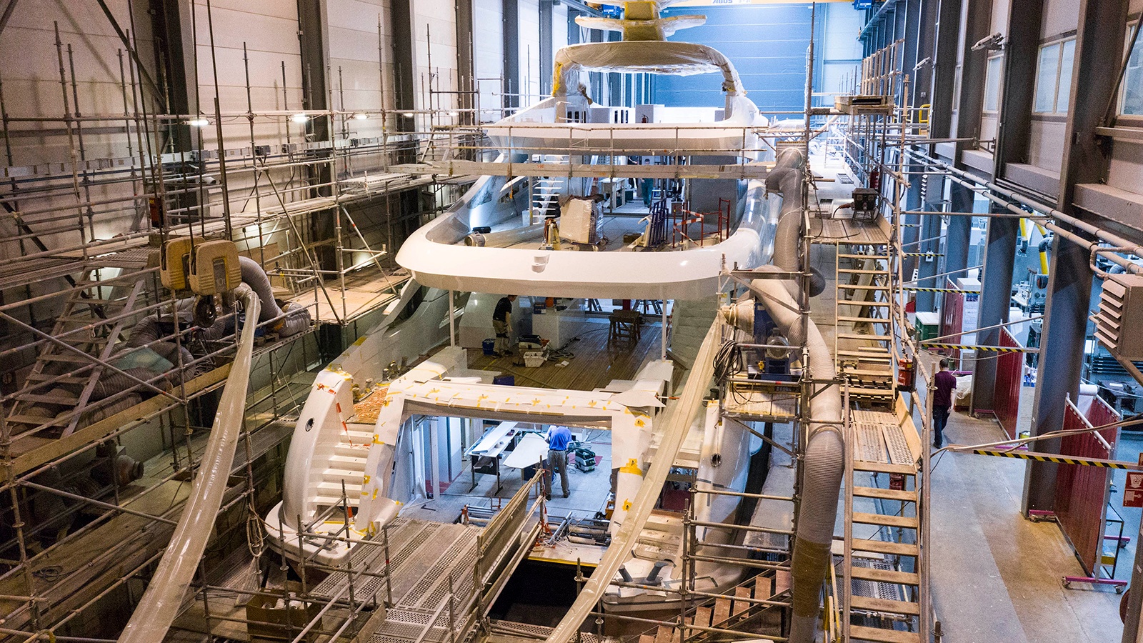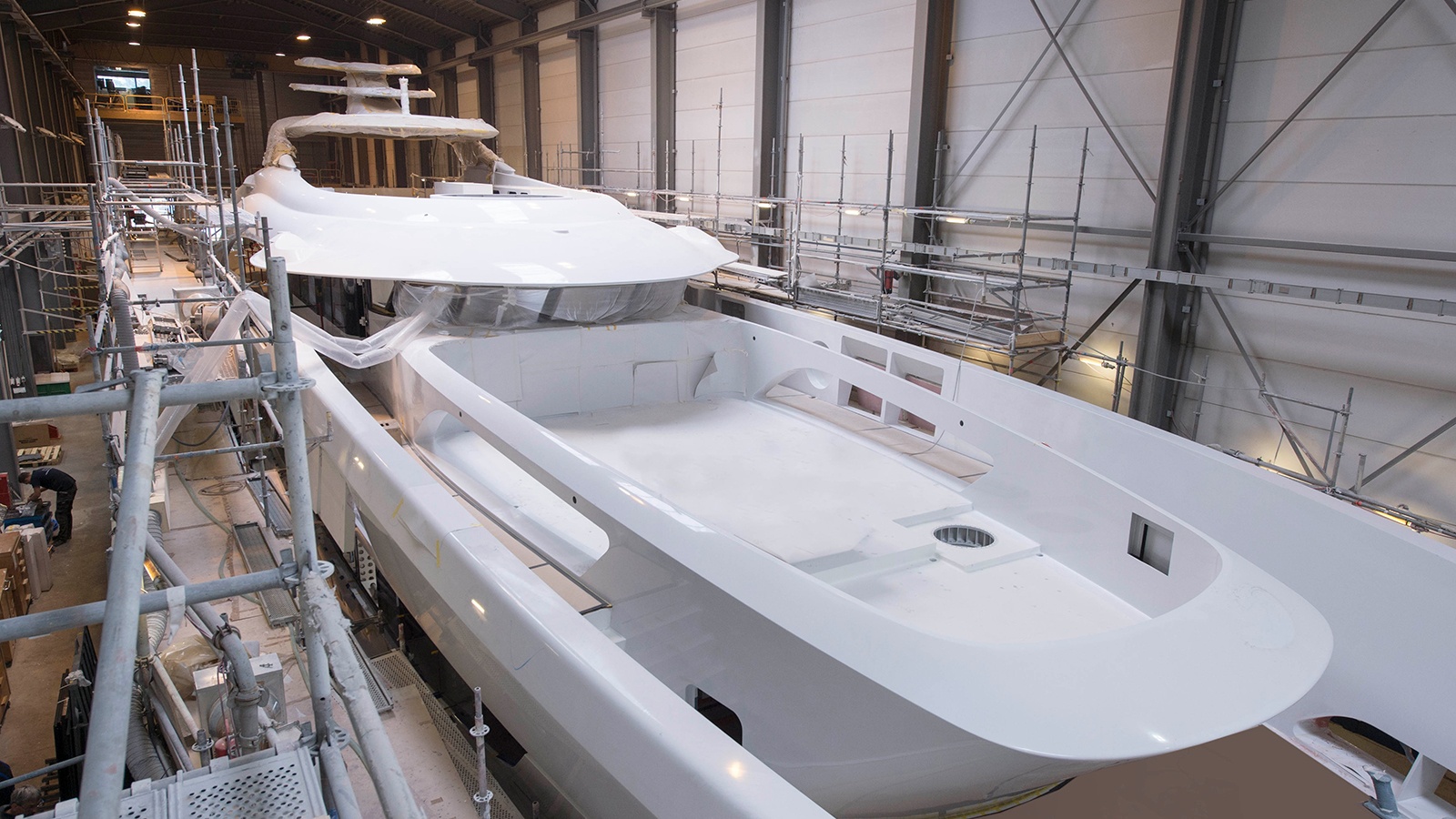 The hull is currently being painted for a powerful and contemporary appearance that boasts sweeping lines from the bow to the stern, with the gunwales and glazing following this curved appearance.