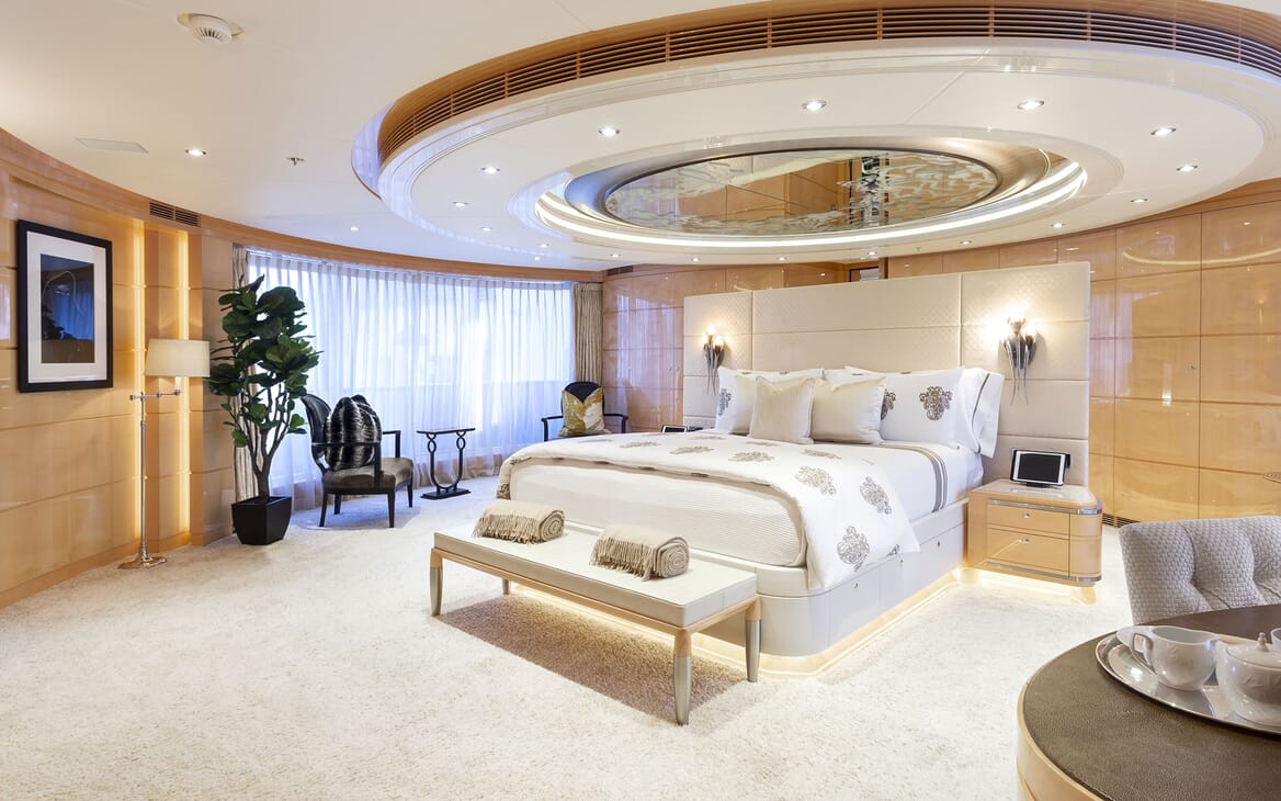 The renowned Omega Architects styled the interiors, creating bright and tranquil spaces that are equally matched for everyday living as well as celebrating a special occasion in style: Pale wooden panelling is matched by cream furnishings and white accents, while the warm glow of the overhead lighting will easily illuminate the space after sundown. A formal dining area is a choice place for intimate family meals, and the main salon and sky lounge provide a place for the kids to watch a film while the adults catch up over drinks from the wet bar.