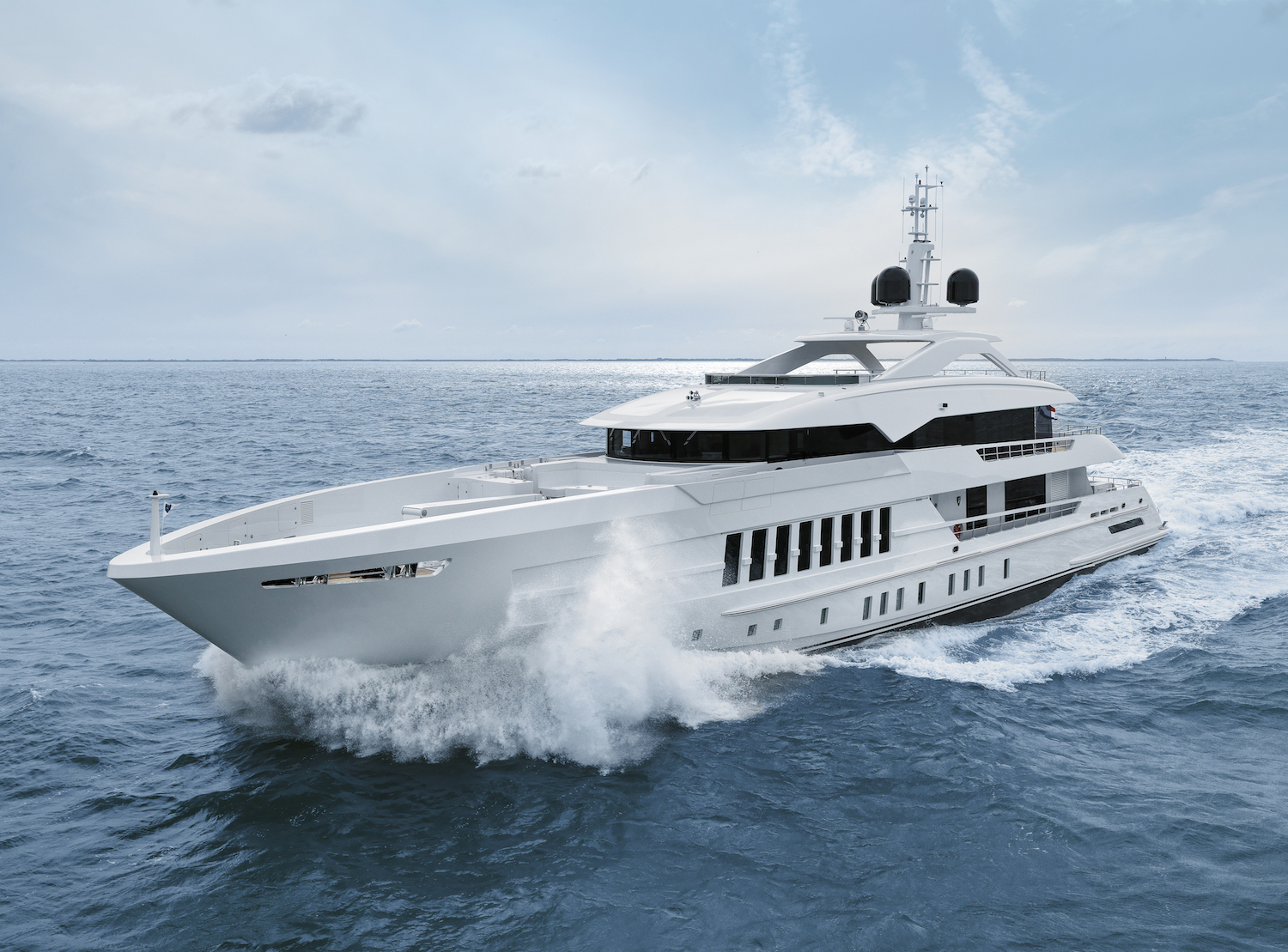 She is the second yacht from the shipyard to be delivered in 2021 and has a modern, muscular appearance created by Omega Architects. The ‘shark tooth’ design of the superstructure overhangs produces a signature appearance, and dark vertical windows contrast against the while hull and superstructure to dramatic effect.