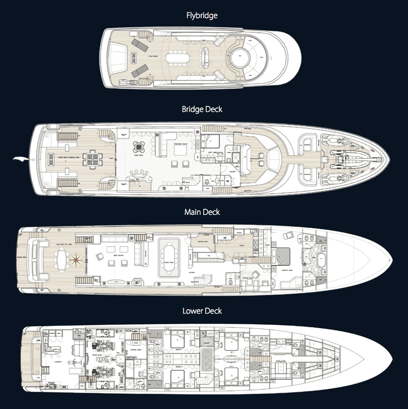 The crew area is located forward at the lower deck, however the Hemisphere 140 motor yacht arrangement provides crew passages to all decks that do not interfere with the guest areas.