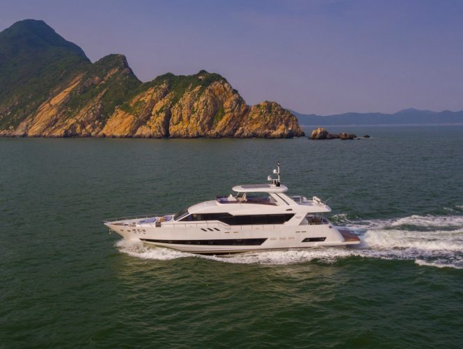 Built with a GRP hull and superstructure, the 29m/95ft Asteria 96 represents a collaboration between the shipyard and Australian naval architect studio David Bentley Yacht Design. Among the interiors is a cutting-edge media room and a Master suite with a walk-in wardrobe.