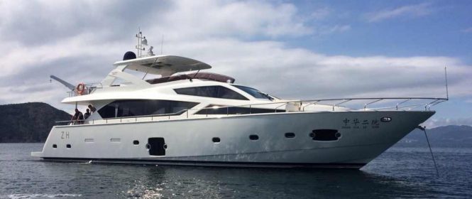 The Heysea 82 is also built with a GRP hull and superstructure, offering a shallow draft of 1.3m/4ft and a beam of 6m/19ft. The accommodation sleeps 8 guests across 4 cabins and Caterpillar engines of 1,136 HP each provide a maximum speed of 23 knots and a cruising speed of 20 knots.