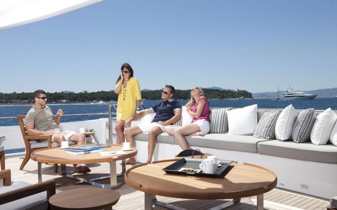 Although the air-conditioned interiors are enticing, life outdoors can be so much more rewarding when you’re anchored in one of the quiet bays along the coast of Sardinia or taking in the views of the Amalfi Coast. The upper deck aft has a grand alfresco dining table shaded by the sundeck overhang for afternoons in the warm summer air and evenings when you don’t want to miss a moment of the sunset.