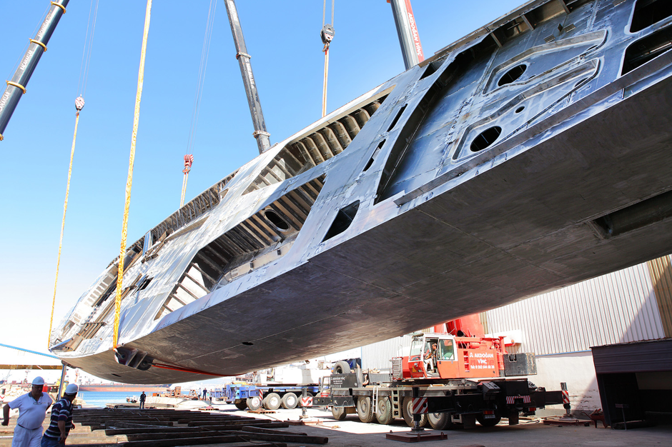 The aluminium hull of the 60m sailing yacht - C.2193, the first of two yachts in the new generation of 60m sailing yachts sold by Perini Navi, was turned at their Perini IstanbulYildiz shipyard.