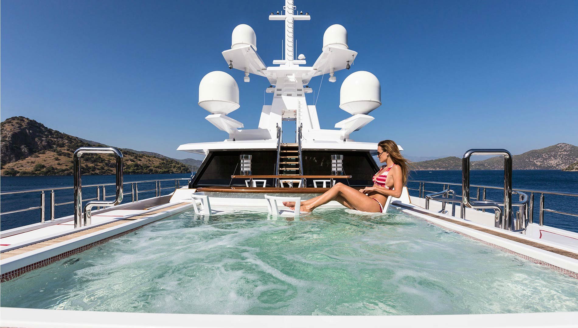 The exterior living is incredibly spacious and very functional. From the main deck aft, charter guest can enjoy the beautiful infinity pool with glass insert, while the extended swim platform below, offers up a huge selection of water toys. The upper aft deck boasts a large alfresco dining table and partial shade. The master stateroom is on this deck and comes complete with private deck and Jacuzzi. On the bridge deck, a Jacuzzi with wrap around sunpads, chaise loungers and wet bar is perfect for casual entertaining. The yacht’s sundeck has further sunpads, seating an BBQ service station.